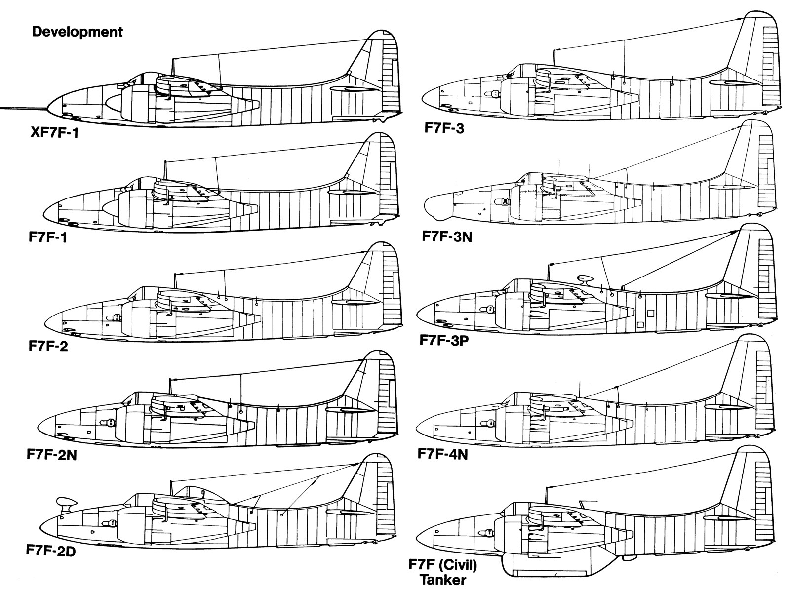 Εξήντα από τα 250 αεροσκάφη έγιναν διθέσια νυχτερινά μαχητικά F7F-3N, τα οποία διέθεταν πολύ χαρακτηριστικό προεξέχον ρύγχος λόγω του νέου ραντάρ τους, SCR-720. Τα F7F-4N έφεραν ενισχυμένες πτέρυγες, επανασχεδιασμένο σύστημα προσγείωσης και πιο εξελιγμένη έκδοση του ιδίου τύπου ραντάρ. Αργότερα, παρήχθησαν λίγα κομμάτια από το F7F-3E με βελτιωμένο ηλεκτρονικό εξοπλισμό, καθώς και κάποια αναγνωριστικά F7F-3P με κάμερες.