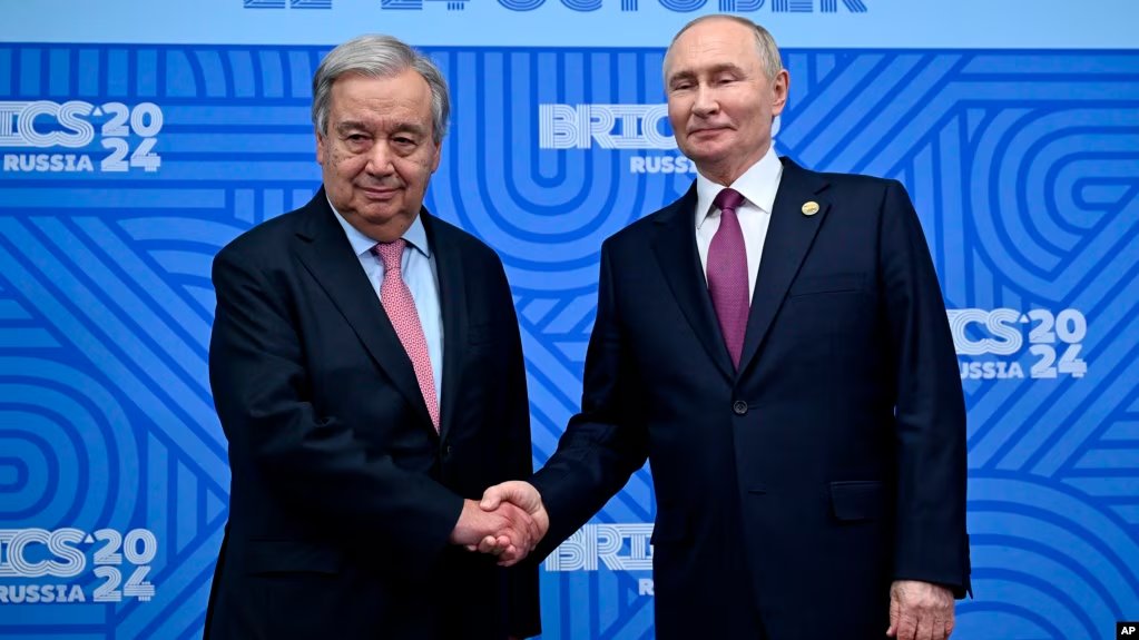 Ο Αντόνιο Γκουτέρες, ο οποίος συναντήθηκε με τον πρόεδρο της Ρωσικής Ομοσπονδίας στο περιθώριο της συνόδου της BRICS στην Καζάν, «επανέλαβε τη θέση ότι η ρωσική εισβολή στην Ουκρανία έγινε κατά παραβίαση του Χάρτη του ΟΗΕ και του διεθνούς δικαίου», σύμφωνα με το δελτίο Τύπου το οποίο δημοσιοποιήθηκε από τις υπηρεσίες του στη Νέα Υόρκη, επαναλαμβάνοντας ακόμη την υποστήριξή του σε «δίκαιη ειρήνη», δυνάμει του Χάρτη και του διεθνούς δικαίου.