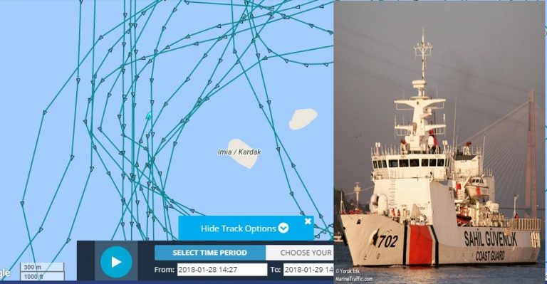 Το πρωί δημοσιεύσαμε άρθρο με τίτλο “Γίνονται τα Ίμια όλο και πιο γκρίζα;“, σχετικά με το κατά πόσο τηρήθηκαν τα “όρια” από πλευράς Τουρκίας, αναφορικά με το σεβασμό στα κυριαρχικά μας δικαιώματα. Αναζητώντας τις κινήσεις της τουρκικής ακταιωρού TCSG GUVEN, κάτι που μπορεί να κάνει οποιοσδήποτε μέσω της σελίδας marinetraffic.com, διαπιστώνουμε πως το τουρκικό σκάφος βρίσκεται σε διαρκή πορεία γύρω και ανάμεσα από τις νησίδες των Ιμίων, παραβιάζοντας συστηματικά τα ελληνικά χωρικά ύδατα, φαινομενικά χωρίς να εμποδίζεται από κανέναν. (Λέμε φαινομενικά, διότι η συγκεκριμένη ιστοσελίδα, δεν καταγράφει πολεμικά σκάφη, πλην σκάφη του λιμενικού).