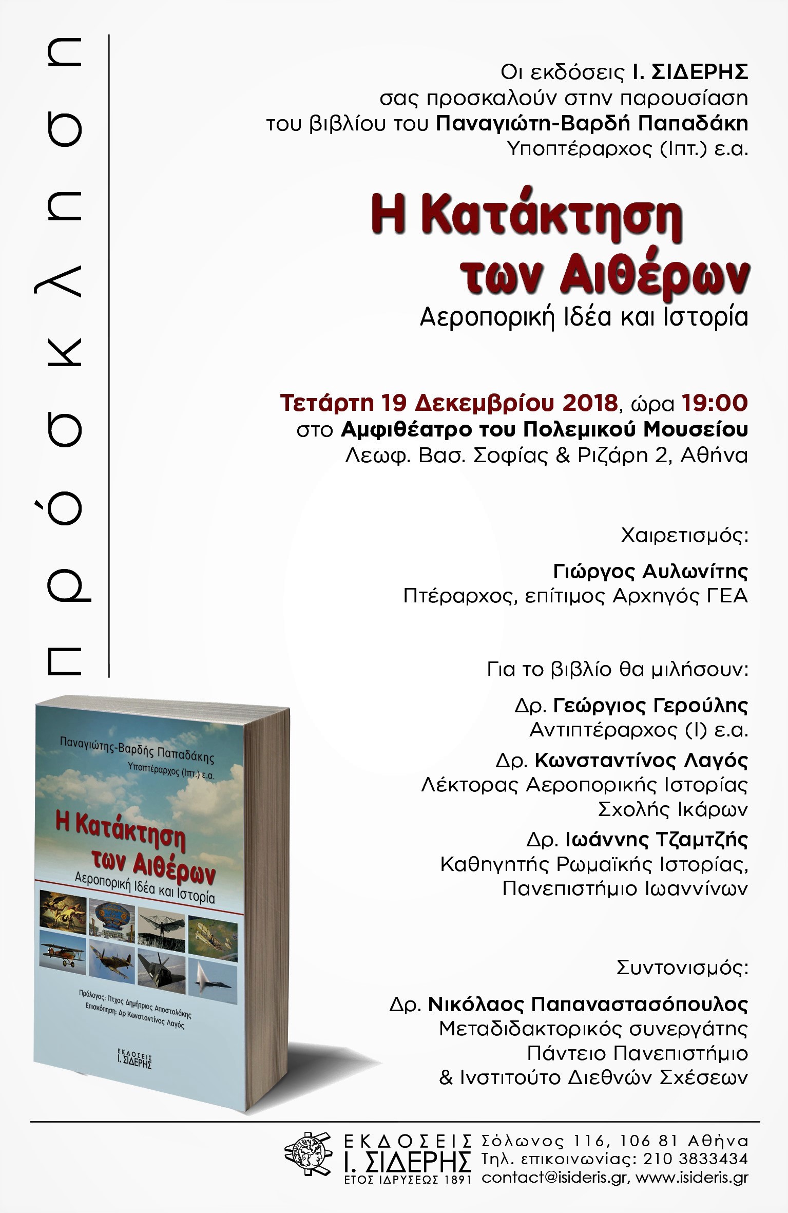 Το νέο βιβλίο του Υποπτεράρχου (Ι) ε.α. Παναγιώτη-Βαρδή Παπαδάκη πραγματεύεται την Αεροπορική Ιστορία στην Ελλάδα και Διεθνώς, θέμα με πολύ μεγάλο εύρος που η κάλυψή του είναι πάντα ένας άθλος. Ο συγγραφέας όμως στην δική απόπειρα έρχεται να μας προσφέρει ένα πλούσιο και ενδιαφέρον σύγγραμμα που καλύπτει την πορεία της ανθρωπότητας στην κατάκτηση της πτήσης και μέσα από αυτή την ιστορία πολεμικών αεροποριών, τόσο της ελληνικής όσο και άλλων χωρών. Ο Παναγιώτης-Βαρδής Παπαδάκης γεννήθηκε το 1933 στα Χανιά. Φοίτησε στη Σχολή Ικάρων με την 26η Σειρά και ονομάστηκε Ανθυποσμηναγός το 1955. Σταδιοδρόμησε στην Πολεμική Αεροπορία ως Ιπτάμενος Αξιωματικός, υπηρετήσας σε Μοίρες μαχητικών αεροσκαφών και σε διοικητικές και επιτελικές θέσεις, αποστρατευθείς το 1981 με τον βαθμό του Υποπτεράρχου. Αξιοσημείωτη σταθμοί στην καριέρα του ήταν ως Διοικητής της 337 Μοίρας αεροσκαφών αναχαίτισης παντός καιρού με F-86D Sabre Dog και στη συνέχεια της νεοσύστατης, το 1969, 353 Μοίρας Ναυτικής Συνεργασίας (MΝΑΣ) με ανθυποβρυχιακά αεροσκάφη HU-16B Albatross. Με τον βαθμό του Σμηνάρχου αξιοποιήθηκε στα παραληφθέντα το 1975-76 αεροσκάφη βομβαρδισμού A-7H Corsair ως Διοικητής της 115 Πτέρυγας Μάχης. Ομοίως, με τον βαθμό του Ταξιάρχου κατέστη ετοιμοπόλεμος στα πολλαπλού ρόλου μαχητικά F-4E Phantom ως Διοικητής της 117 Πτέρυγας Μάχης. Υπηρέτησε σε επιτελικές θέσεις στο ΓΕΑ, στο 6ο Αεροπορικό Στρατηγείο του ΝΑΤΟ στη Σμύρνη (SIXATAF), στο ΓΕΕΘΑ και με τον βαθμό του Ταξιάρχου ως Διοικητής της Σχολής Πολέμου Αεροπορίας και Διευθυντής Β’ Κλάδου ΓΕΑ. Φοίτησε σε σχολεία επαγγελματικής επιμόρφωσης εντός και εκτός Ελλάδας, όπως: Εκπαιδευτών Πτήσεως δι’ οργάνων, Special Warfare School στις ΗΠΑ, Combat Air Operations Specialist Course στη Γερμανία (USAFE) και Ανωτέρα Σχολή Πολέμου. Μετά την αποστρατεία του το 1981, ασχολήθηκε αφιλοκερδώς με τη συγγραφή μονογραφιών, όπως: «Ίκαροι-Οι σύγχρονοι μονομάχοι», «Ελληνικά φτερά στον πόλεμο της Κορέας», «Οι Μοίρες της ερήμου» (συμμετοχή), «Η πορεία προς την ενιαία Πολεμική Αεροπορία» (συμμετοχή), «Ελληνικά ακροβατικά σμήνη» (συμμετοχή), καθώς επίσης και με αεροπορική αρθρογραφία.