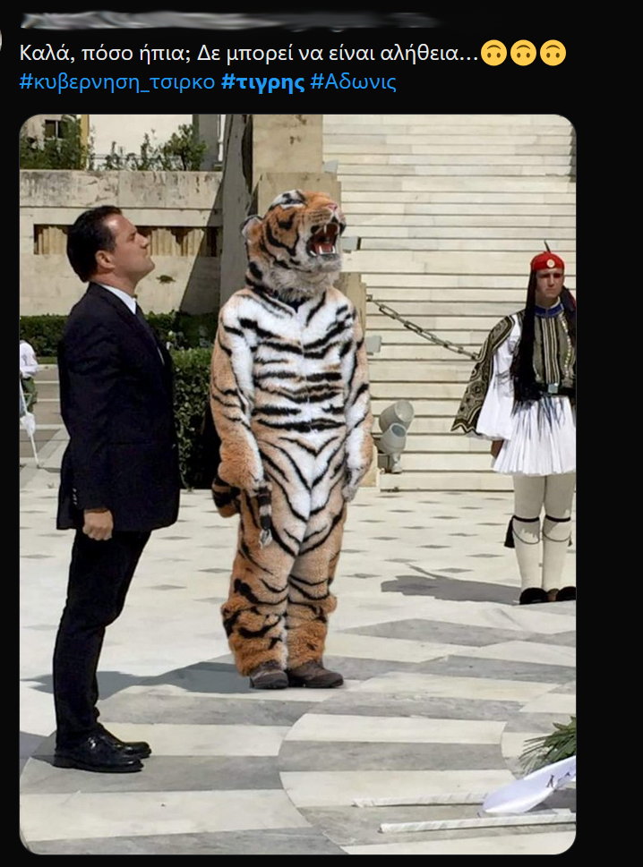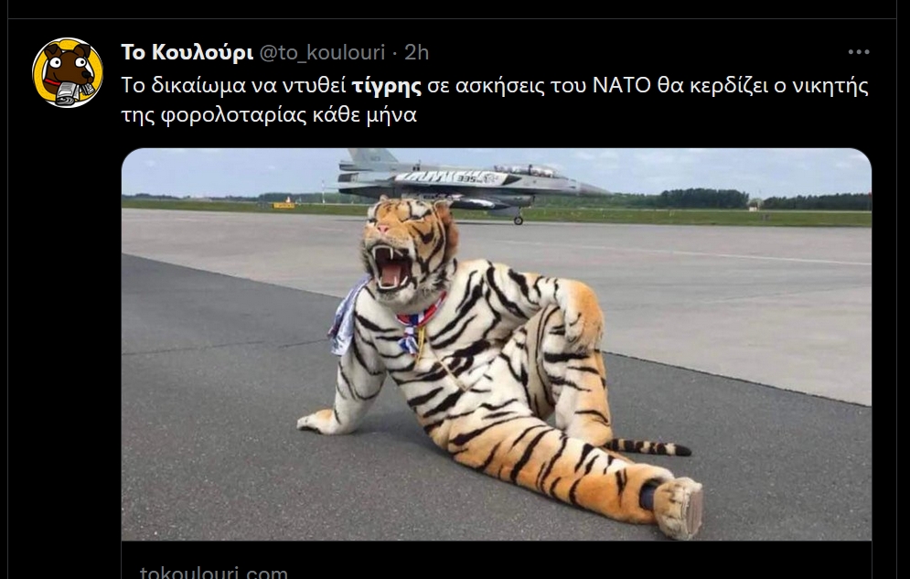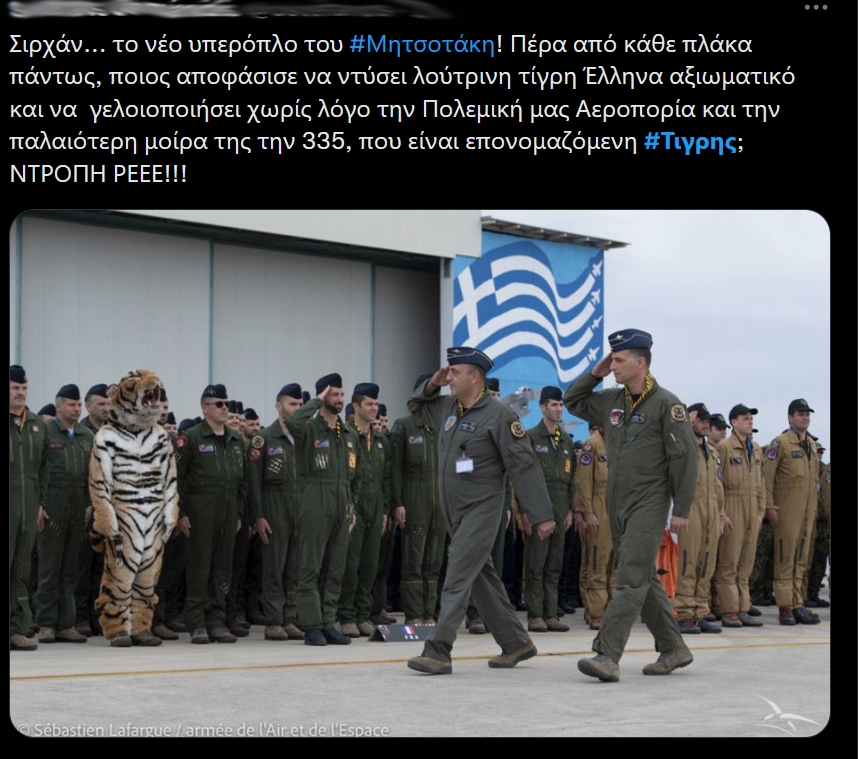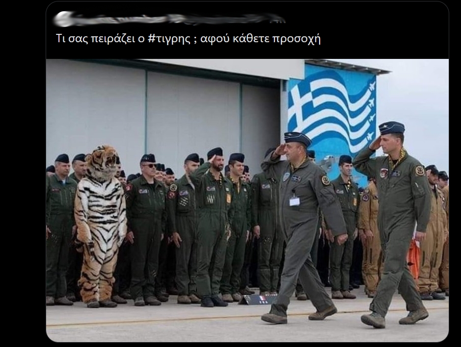 Το είδαμε και αυτό. Στην έναρξη της πολυεθνικής νατοικής άσκησης Tiger Meet που έγινε στο αεροδρόμιο του Αράξου -για πρώτη φορά διοργανώνεται στην Ελλάδα- εμφανίστηκε μια μασκοτ «τίγρης» κατά την επιθεώρηση πληρωμάτων και τεχνικών. Και… ξέσπασε το κύμα κοροϊδίας στα ελληνικά social media με τις σχετικές εικόνες να γίνονται viral. Το τι διαβάζουμε δεν λέγεται: Από ότι «ξεφτιλίστηκε η Πολεμική Αεροπορία» μέχρι ότι «γίναμε τσίρκο». Παρακάτω δείτε μερικά σχόλια για να πάρετε γεύση.