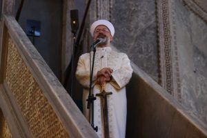 Στην Αγιά Σοφιά την προσευχή και την ομιλία έκανε ο Αλί Ερμπάς, ο πρόεδρος της Επιτροπής Θρησκευτικών Υποθέσεων της Τουρκίας, ο οποίος κρατώντας τελετουργικό σπαθί (ως συμβολισμό ισλαμικής κινητοποιήσης) είπε πως “…δηλώνω σε όλο τον κόσμο πως καμμία καταπίεση και αδικία είναι αιώνια. Ανεξάρτητα του πόσο ισχυρός νομίζει πως είναι ο επιβολέας, σίγουρα θα ηττηθεί”.