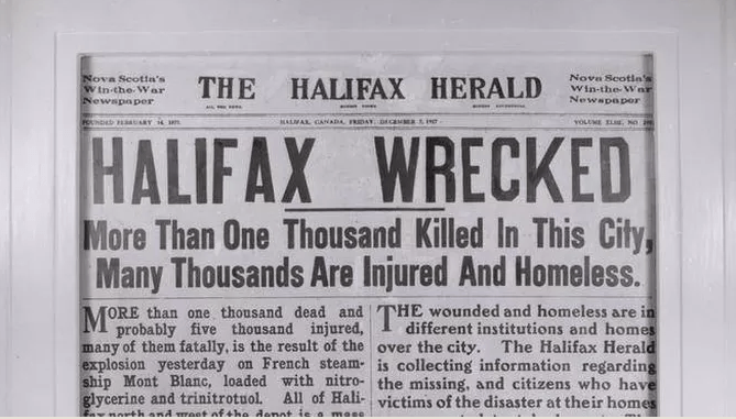 Στις 09:04′ το πρωί της 6ης Δεκεμβρίου 1917, το γαλλικό πλοίο Mont-Blanc, πλήρες πολεμοφοδίων, εξερράγη στο λιμάνι, προκαλώντας ακαριαίο θάνατο σε περισσότερους από 1.900 άνδρες, γυναίκες και παιδιά, τραυματίζοντας περισσότερα από 9.000 άτομα, ενώ περίπου 200 άτομα τυφλώθηκαν από τα θραύσματα των υαλοπινάκων ή από την λάμψη της έκρηξης.