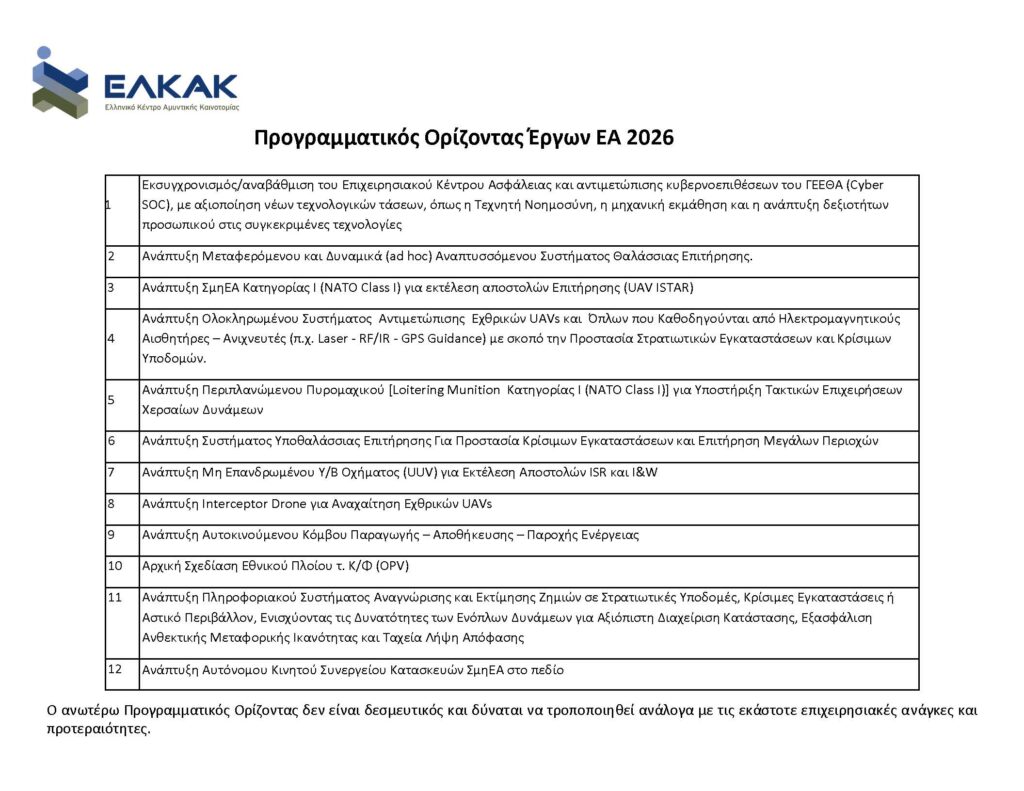 Το Ελληνικό Κέντρο Αμυντικής Καινοτομίας (ΕΛΚΑΚ) ανακοινώνει τον Προγραμματικό Ορίζοντα 2026, το βασικό στρατηγικό πλαίσιο που καθορίζει τις θεματικές προτεραιότητες, τις επιχειρησιακές ανάγκες και τον τρόπο με τον οποίο η εταιρεία σκοπεύει να λειτουργήσει ως καταλύτης στην επιχειρησιακή αξιοποίηση της καινοτομίας, ενεργοποιώντας τα χρηματοδοτικά και μη χρηματοδοτικά του εργαλεία την προσεχή χρονιά.