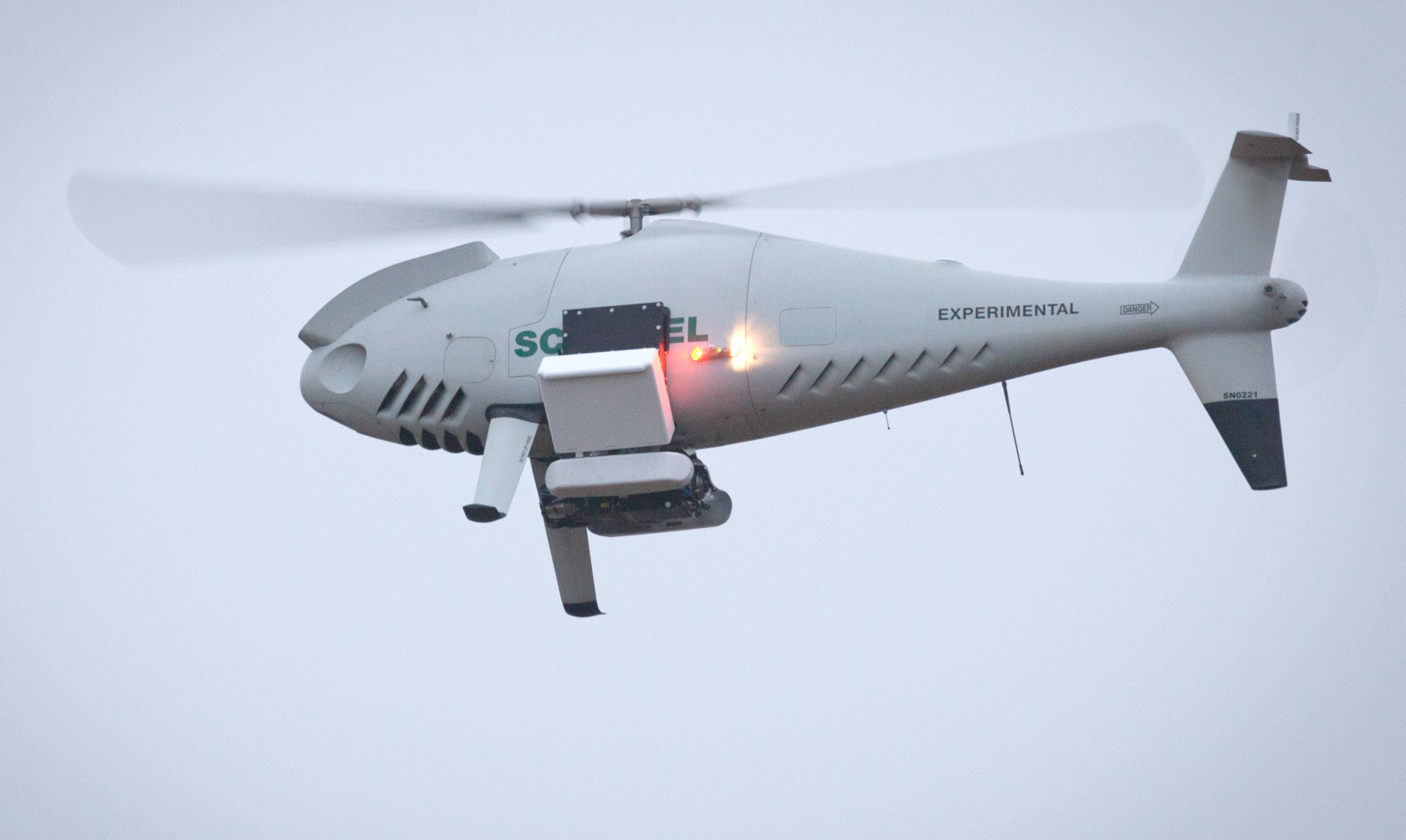 S-100 σε δοκιμές με το Αμερικανικό Ναυτικό. Στον κοιλιακό φορέα το σύστημα Pushbroom Imaging Lidar for Littoral Surveillance (PILLS) της εταιρείας ARETE. πηγή Schiebel.net