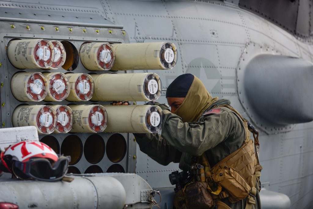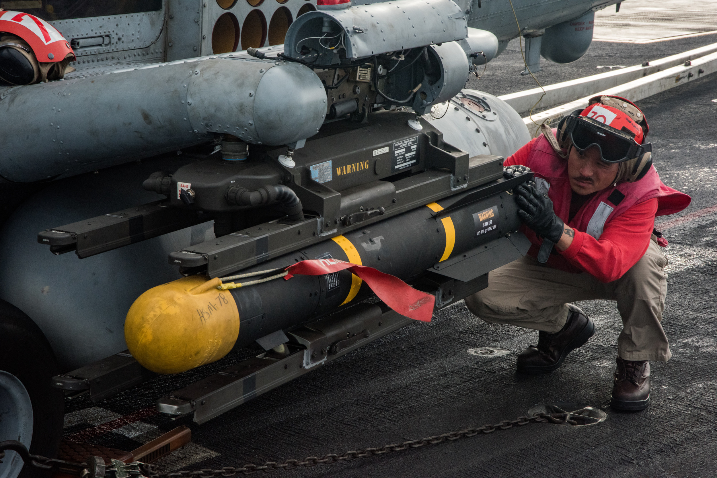 PACIFIC OCEAN (Nov. 13, 2017) Ensign Keith Villanueva, assigned to the “Blue Hawks” of Helicopter Maritime Strike Squadron (HSM) 78, inspects the mounting of an AGM 114 Hellfire missile on an MH-60R Sea Hawk helicopter on the flight deck of the Nimitz-class aircraft carrier USS Carl Vinson (CVN 70). Carl Vinson is participating in a sustainment training exercise in preparation for an upcoming deployment. (U.S. Navy photo by Mass Communication Specialist Seaman Dylan M. Kinee/Released)