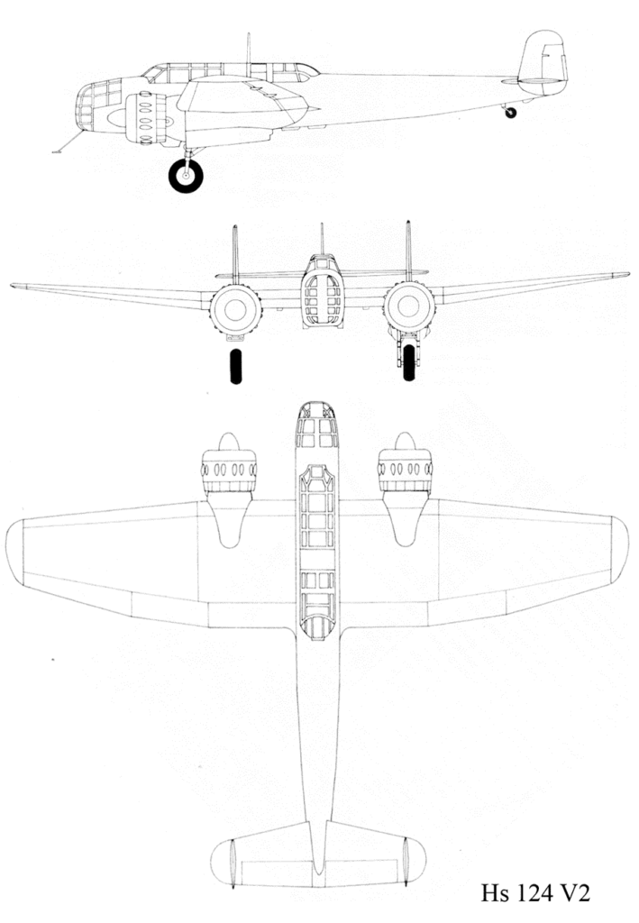 Και τα τρία πρωτότυπα ολοκληρώθηκαν το 1935, με το πρώτο (Hs 124 V1) να πραγματοποιεί την παρθενική του πτήση την Άνοιξη του 1936. Διακρινόταν για το μεταλλικό του ρύγχος, στην κορυφή του οποίου ήταν τοποθετημένος ένας περιστρεφόμενος πυργίσκος που θα έφερε ένα αυτόματο πυροβόλο Rheinmetall Borsig των 20 χιλ. (Να σημειώσουμε παρενθετικά ότι οι δοκιμές έλαβαν χώρα χωρίς αυτό, εξαιτίας άλυτων, έως εκείνη τη στιγμή, προβλημάτων με την προσαρμογή του). Στο Hs 124 V2, το μεταλλικό ρύγχος αντικαταστάθηκε με γυάλινο, ώστε να προσομοιάζει με μαχητικό-καταδιωκτικό (kampfzerstörer). Θα εξοπλιζόταν με δύο πυροβόλα των 20 χιλ. και ένα αμυντικό πολυβόλο MG 15 των 7,92 χιλ., χειριζόμενο από την οπίσθια θέση του πυροβολητού. Είχε επίσης τη δυνατότητα μεταφοράς βομβών συνολικού βάρους 600 κιλών. Ακολούθησε το Hs 124 V3, τύπου zerstörer, όπου το προσωπικό θα μειωνόταν από τρία, σε δύο μέλη, ενώ το ρύγχος ήταν τροποποιημένο ώστε να δέχεται δύο σταθερά πυροβόλα των 20 χιλ. και δύο ακόμη πολυβόλα MG 15.