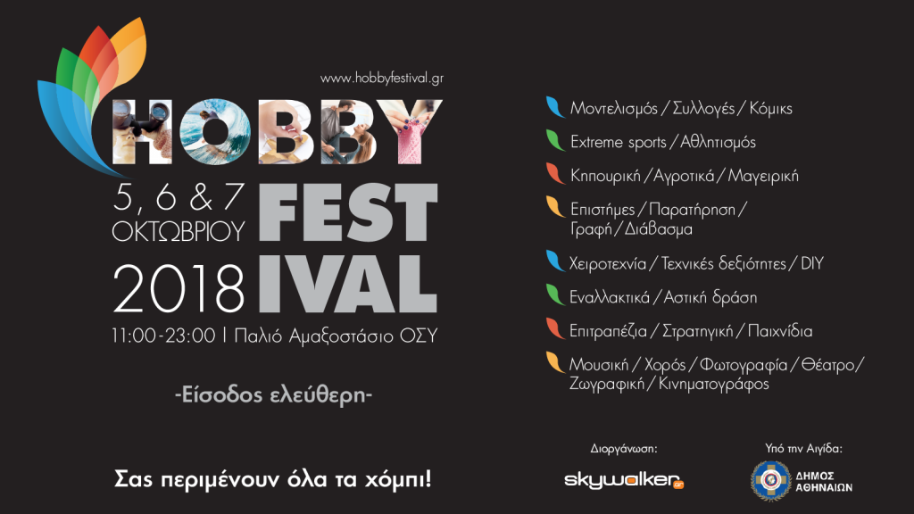 Το Hobby Festival, ένα το μοναδικό event για όλες τις ερασιτεχνικές ασχολίες και για την αξιοποίηση του ελεύθερου χρόνου με τον καλύτερο και αποδοτικότερο τρόπο, επιστρέφει για το 2018 από 5 έως 7 Οκτωβρίου στο Παλιό Αμαξοστάσιο του ΟΣΥ.