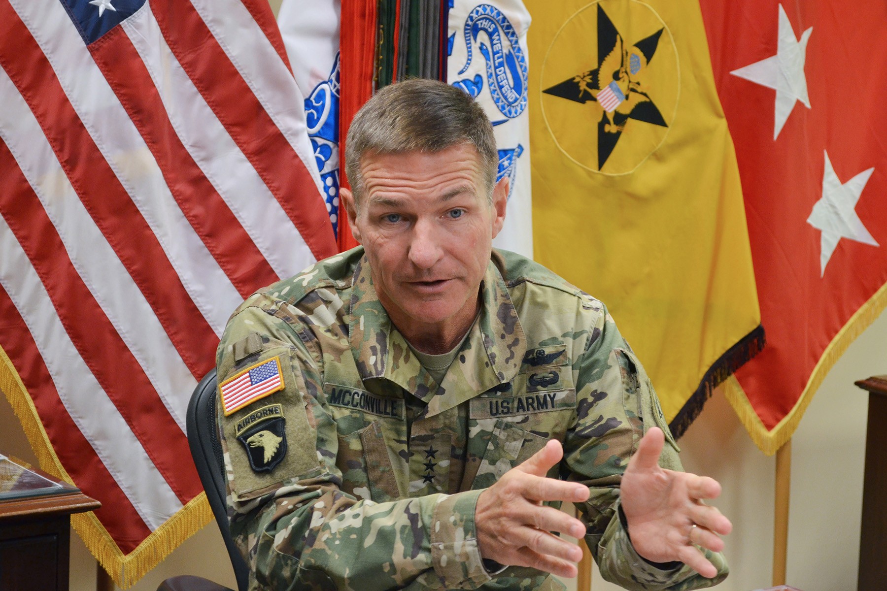 «Δυστυχώς, για πρώτη φορά στην ιστορία του υπουργείου Άμυνας, δύο από τα Σώματά μας λειτουργούν χωρίς ηγεσία εγκεκριμένη από τη Γερουσία», σχολίασε ο υπουργός Άμυνας Λόιντ Όστιν σε μια τελετή για την αποστράτευση του Στρατηγού Τζέιμς ΜακΚόνβιλ (κεντρική φωτό), του μέχρι σήμερα αρχηγού του γενικού επιτελείου του Στρατού Ξηράς. Ο ΜακΚόνβιλ πρόκειται να αντικατασταθεί από τον Ράντι Τζορτζ, τον υπαρχηγό του Σώματος, ο οποίος θα αναλάβει «προσωρινός» αρχηγός μέχρι να εγκριθεί ο διορισμός του.
