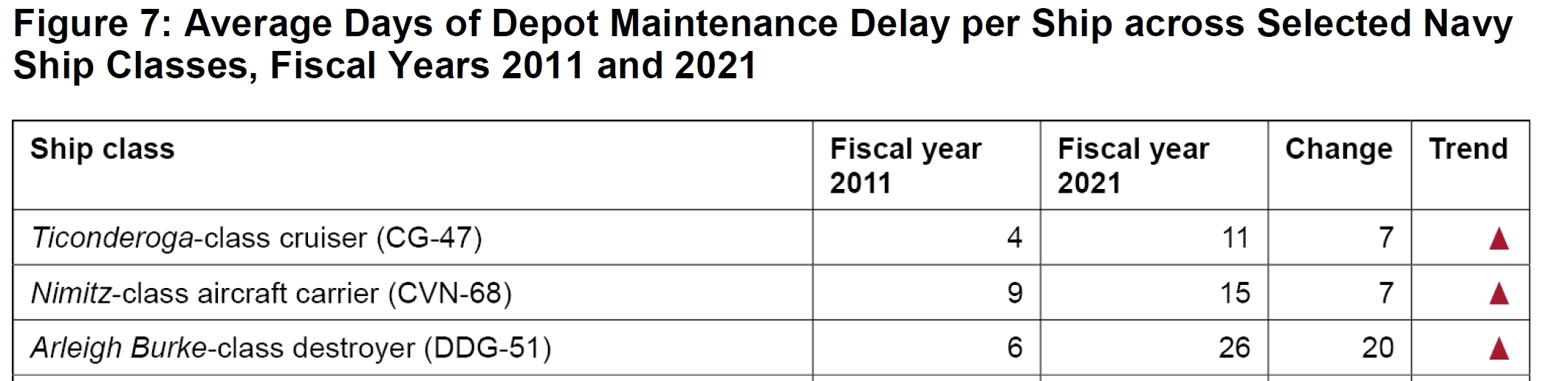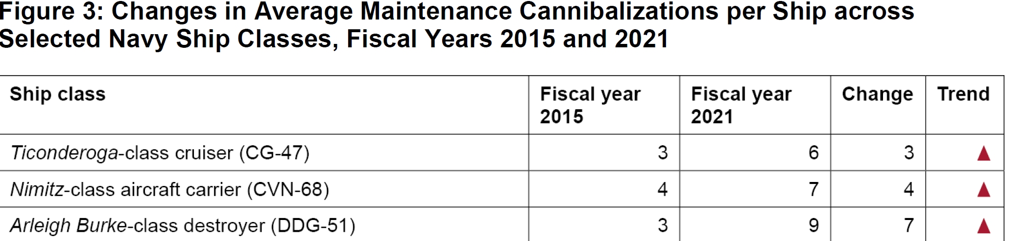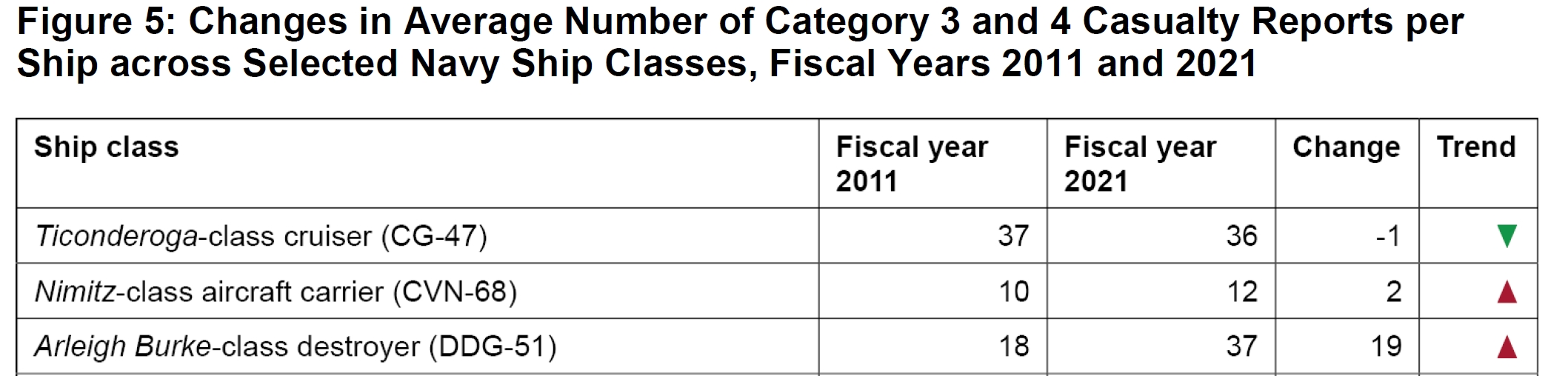 Η μελέτη του GAO έγινε για 10 κλάσεις πλοίων του USN από το 2011 έως 2021. Αυτές όμως που μας ενδιαφέρουν, είναι τα πλοία πρώτης γραμμής, δηλαδή τα κλάσης Ticonderoga (καταδρομικά), τα κλάσης Nimitz (αεροπλανοφόρα) και τα κλάσης Arleigh Burke (αντιτορπιλικά). Εδώ λοιπόν τα βασικά μετρητικά στοιχεία, ήτοι κανιβαλισμοί, αναφορές βλαβών 3 και 4 καθώς και οι ημέρες καθυστέρησης στην συντήρηση, παρουσιάζονται συγκεντρωτικά στον παρακάτω πίνακα.