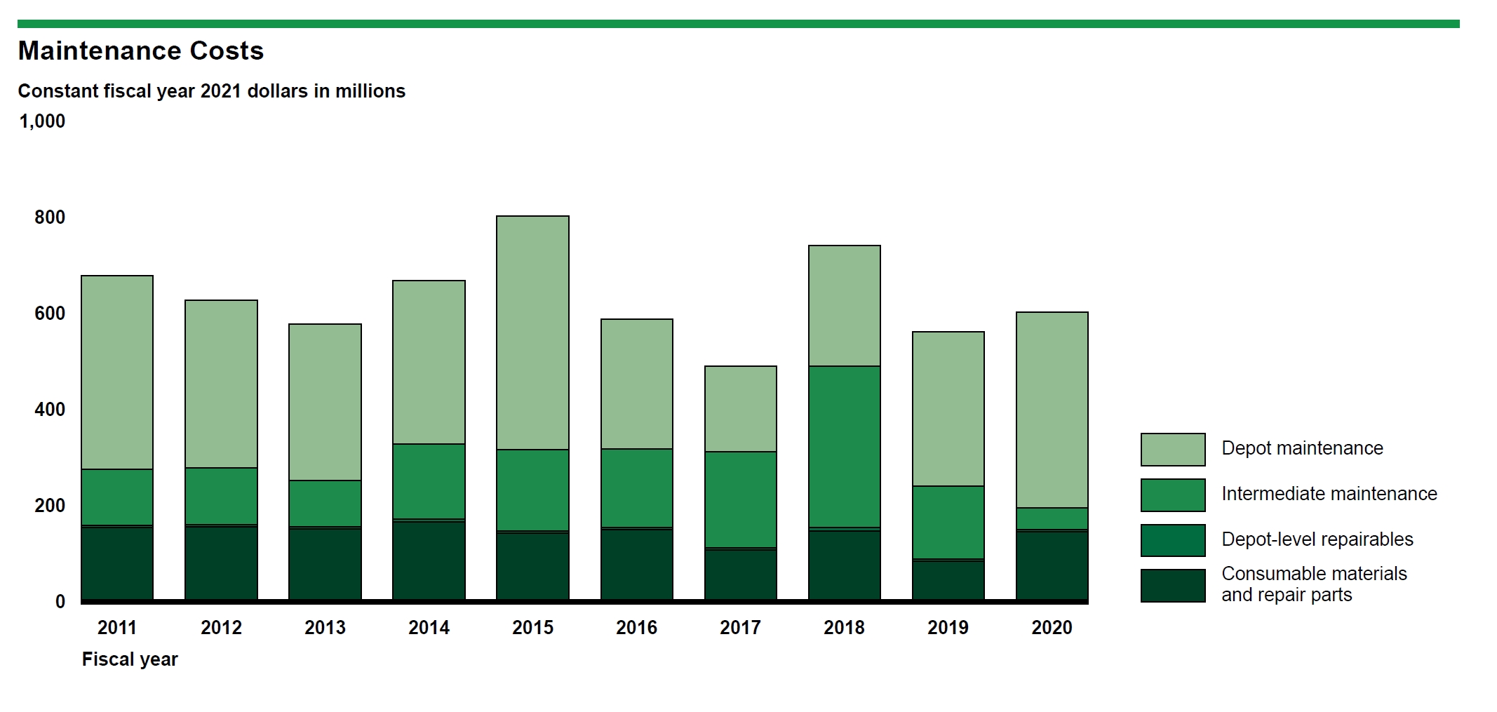 Εδώ έχουμε ένα κόστος 27 εκατομμυρίων δολαρίων (πάντα για τα Ticonderoga σε αμερικανική υπηρεσία), που σύμφωνα με το παρακάτω γράφημα του GAO και για τα δύο τελευταία χρόνια 2020 και 2021, χωρίζεται ποσοστιαία: