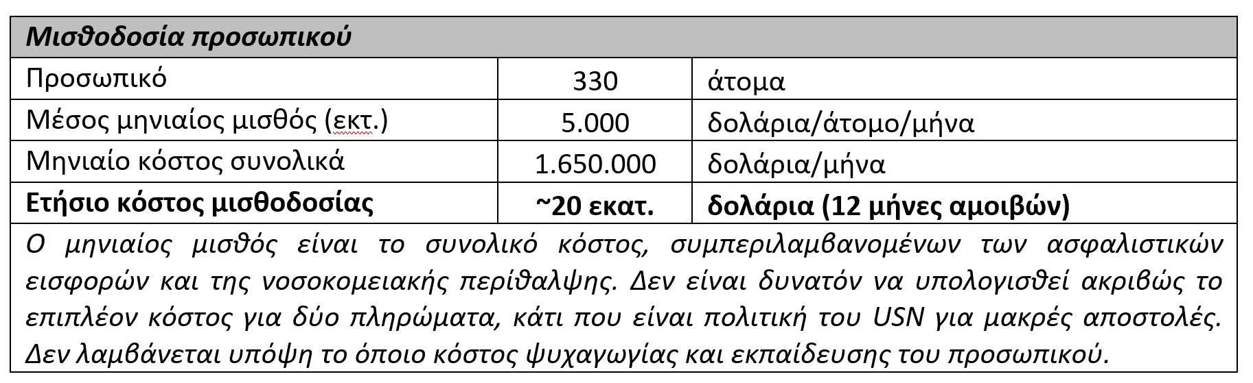 - Μέσα στα πλοία αυτά υπάρχουν 330 άτομα για τα οποία εκτιμάται ότι το USN δεν φείδεται πιστώσεων – στα πλαίσια του εφικτού – σε παροχές και ποιότητα διαβίωσης, προκειμένου να διατηρήσει υψηλό ηθικό και ετοιμότητα. Δεν είναι εύκολη η ζωή σε ένα πολεμικό πλοίο σε τέτοιες αποστολές για τόσες πολλές ημέρες.