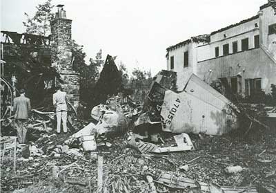 Νομίζοντας πως κάποιο πρόβλημα με το σύστημα ανάσυρσης του δεξιού τροχού ευθυνόταν για την οπισθέλκουσα, ο Hughes προσπάθησε να κρατήσει το αεροσκάφος σε ευθεία πορεία κατεβάζοντας του αριστερούς εκτροπείς. Το αποτέλεσμα ήταν η περαιτέρω επιβράδυνσή του. Βρισκόμενο τώρα επάνω από κατοικημένη περιοχή, το XF-11 κατέβηκε και έπεσε σε τέσσερα σπίτια, όπου συνετρίβη και άρχισε να φλέγεται. Ο Hughes κατόρθωσε να εξέλθει, λαμβάνοντας τις πρώτες βοήθειες από τους γύρω κατοίκους και τους γιατρούς που κατέφθασαν. Υπέστη όμως πολλαπλούς τραυματισμούς, συμπεριλαμβανομένων σοβαρών εγκαυμάτων, τουλάχιστον ένδεκα σπασμένων πλευρών, τρυπημένο πνεύμονα και μετατόπιση καρδιάς. Αξιοσημείωτο είναι πως ανάρρωσε σχεδόν πλήρως, αλλά από το τραγικό αυτό περιστατικό ξεκίνησε o εθισμός του στην κωδεΐνη, που θα του προκάλεσε άλλα προβλήματα καθ’ όλη τη μετέπειτα ζωή του.