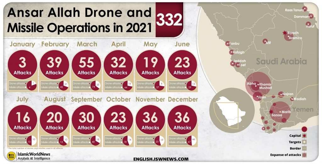 Ένα ενδιαφέρον infographic δημοσίευσε το Islamic World News καταγράφοντας το σύνολο των επιθέσεων των ανταρτών Χούθι της Υεμένης κατά της Σαουδικής Αραβίας με drone και πυραύλους για όλο το 2021. Έτσι συνολικά έγιναν 332 επιθέσεις κυρίως στην δυτική πλευρά της χώρας, εκεί δηλαδή που βρίσκονται σημαντικά λιμάνια και πετρελαϊκές εγκαταστάσεις (όπως η Τζέντα, το Γιάνμπου και το Τζιζάν), με προφανή στόχο να διαταράξουν το εμπόριο υδρογονανθράκων που αποτελεί το κύριο έσοδο των Σαουδαράβων.