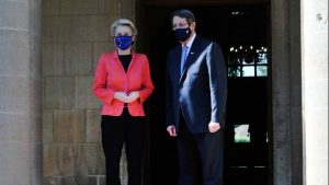 Παραδίδοντας την έγκριση του σχεδίου Ανάκαμψης και Ανθεκτικότητας για την Κυπριακή Δημοκρατία στον Πρόεδρο Νίκο Αναστασιάδη, η κ. φον ντερ Λάιεν αναφέρθηκε και στα σχέδια του Προέδρου της Τουρκίας Ρετζέπ Ταγίπν Ερντογάν να επισκεφθεί τα κατεχόμενα στις 20 Ιουλίου, ενώ απαντώντας σε σχετική ερώτηση για το τι μπορεί να αναμένει η Κύπρος από την ΕΕ, δήλωσε: «Αυτό που μπορεί να αναμένει η Κύπρος -και είναι το πλέον πολύτιμο κομμάτι- είναι η ενότητα της ΕΕ και η γνώση ότι όλα, και τα 26 κράτη μέλη της ΕΕ, στεκόμαστε στο πλευρό σας.
