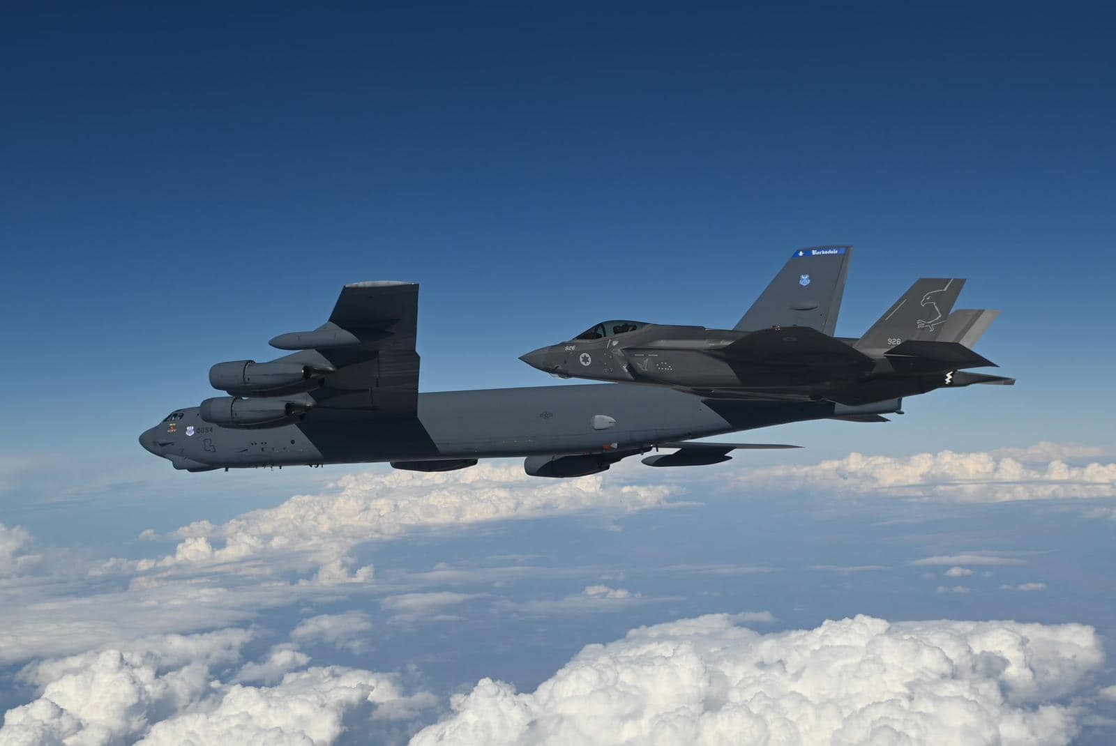 Δύο μαχητικά αεροσκάφη F-35I «Adir» της ισραηλινής πολεμικής αεροπορίας (IAF) συνόδευσαν δύο βομβαρδιστικά B-52, τα οποία πέταξαν πάνω από τον ουρανό του Ισραήλ.