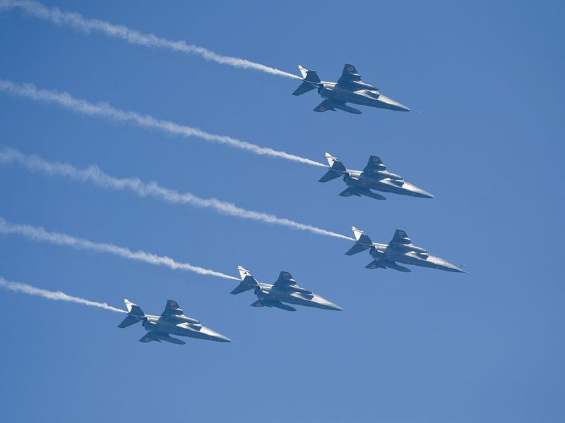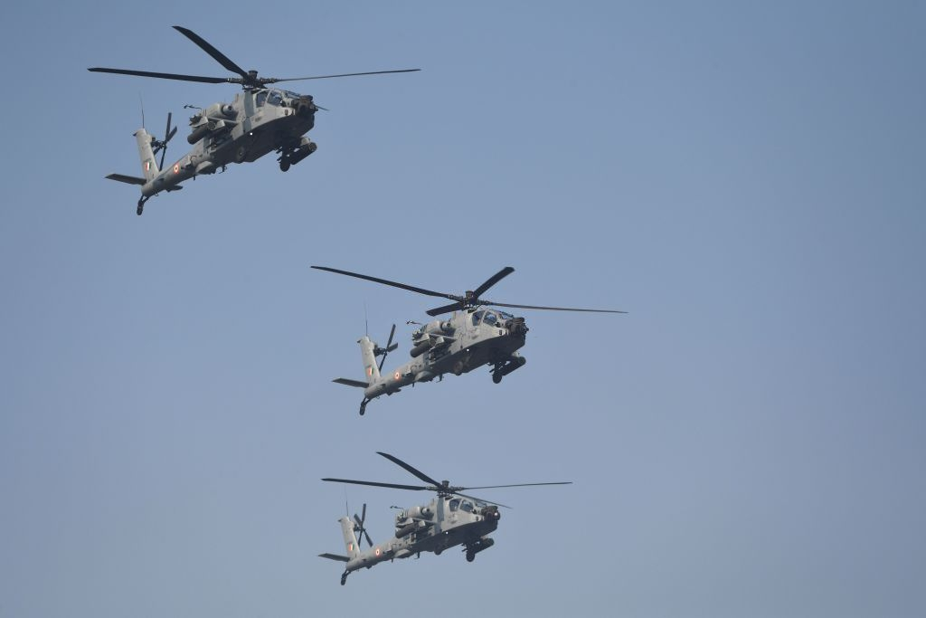 Τα νεοαποκτηθέντα Apache πραγματοποίησαν διέλευση σε σχηματισμό, όπως και ελικόπτερα ALH ‘Dhruv’ (κατασκευασμένα από την HAL με βοήθεια στο στάδιο ανάπτυξης από την γερμανική MBB) και Chinook σε σχηματισμό ‘Vic’. Όμως τα πέντε αναβαθμισμένα MiG-29UPG ‘Baaz’ (Γεράκι στα ινδικά) σε σχηματισμό βέλους και η τριάδα των Su-30MKI που πέρασε χαμηλά «σπάζοντας» στην συνέχεια για τον ελιγμό ‘trishul’ (τρίαινα) κράτησε το βλέμμα των θεατών ψηλά μετά το… ζέσταμα της διέλευσης των Jaguar που είχε προηγηθεί στα 300 μ. με ταχύτητα 780 χλμ/ώρα. Μετά από διελεύσεις και άλλων τύπων, την παρέλαση έκλεισε το solo display ενός Su-30MKI το οποπίο ερχόμενο χαμηλά με 900 χλμ/ώρα αναρριχήθηκε βρυχώμενο εκτελώντας τον ελιγμό ‘Vertical Charlie’.