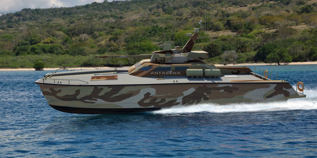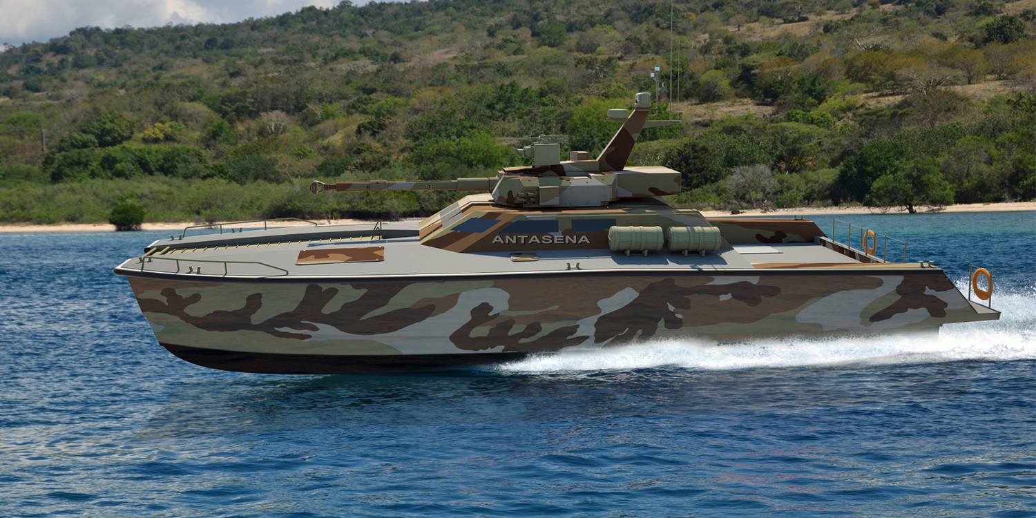 Κέφια πρέπει να είχαν οι σχεδιαστές της ινδονησιακής εταιρίας North Sea Boats, καθώς παρουσίασαν πρόσφατα το X18 Tank Boat Antasena. Και είναι ακριβώς αυτό που ακούγεται. Ένα σκάφος επιφανείας, σχεδίασης καταμαράν με ταχύτητα 40 κόμβων, το οποίο διαθέτει πύργο άρματος με πυροβόλο 105 χιλιοστών της Cockerill!