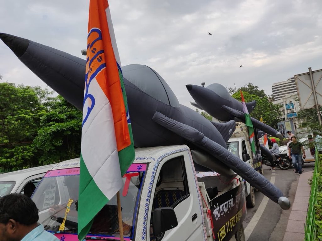 Τα πρώτα Rafale εμφανίστηκαν στην Ινδία, έστω και ως φουσκωτά ομοιώματα στη διάρκεια πολιτικής συγκέντρωσης διαμαρτυρίας. Προσέξτε τη σημασία στη λεπτομέρεια… canard και air refueling probe!