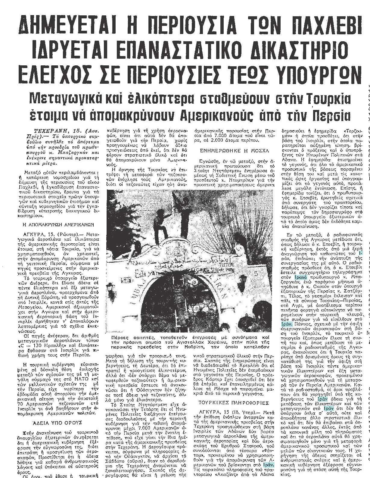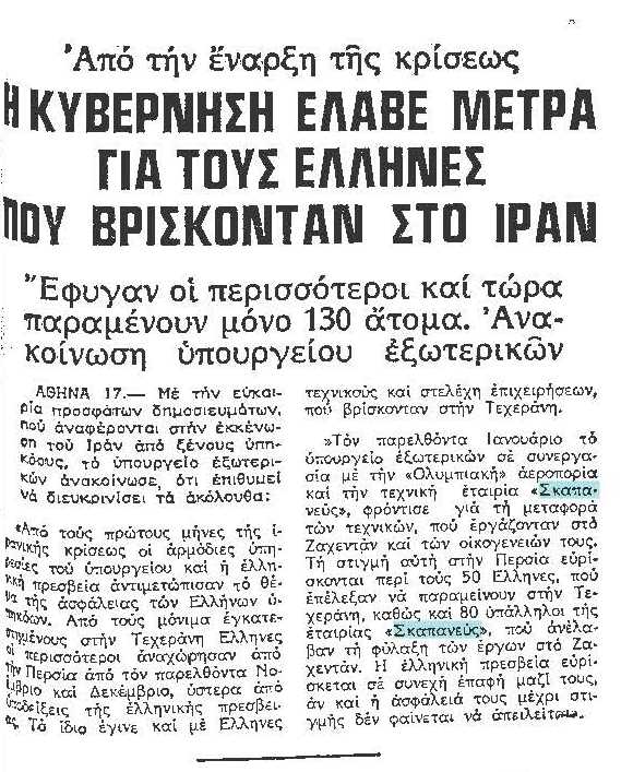 Οι Πέρσες μας συμπεριφέρθηκαν άψογα και έκαναν τα πάντα για την ασφάλειά μας. Μέσα στο χάος της Ισλαμικής Επανάστασης συνεννοήθηκαν με την τότε Ελληνική κυβέρνηση (του Κωνσταντίνου Καραμανλή) για τον τρόπο εκκένωσης όλων των Ελλήνων από την επικράτεια του Ιράν. Ήταν πολύ καλά συντονισμένοι και φάνηκε από τον ελάχιστο χρόνο που περιμέναμε στο Ζαχεντάν για να φτάσει και να μας παραλάβει το 707 της Ολυμπιακής. Οι πιλότοι του συγκεκριμένου αεροπλάνου ήταν καταπληκτικοί, δεν ξέρω αν υπάρχει προηγούμενο προσγείωσης και απογείωσης μεγάλου επιβατικού τζετ από αεροδρόμιο χωρίς βοηθήματα και χωρίς πύργο ελέγχου, και υπερπλήρες επιβατών. Υπάρχουν πάρα πολλές άλλες λεπτομέρειες και παράπλευρες ιστορίες, αλλά θα έκαναν τεράστια την αφήγηση.