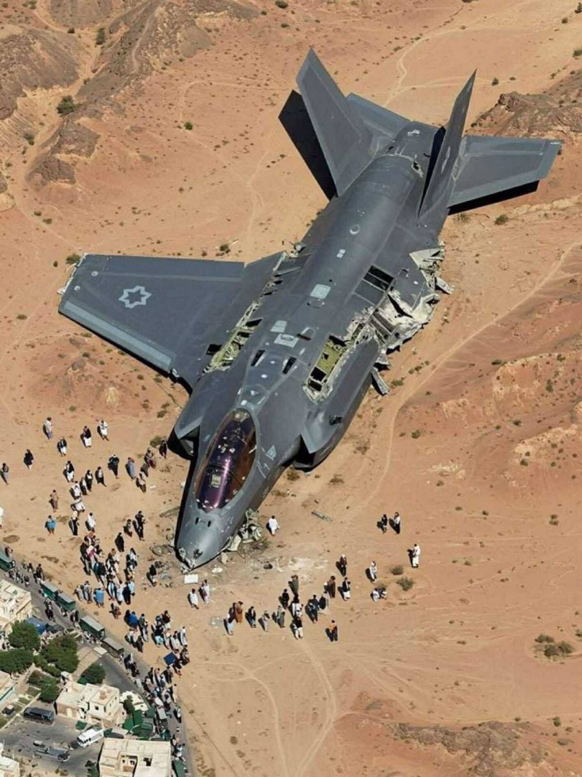 Έτσι βλέπουμε εικόνες σαν την παραπάνω που υποτίθεται απεικονίζουν “κατάρριψη ισραηλινού F-35”, το ίδιο και η παρακάτω, αλλά με έως και γελοία παραμόρφωση των εικόνων που φανερά -τουλάχιστον για όσους γνωρίζουν λίγο από αμυντικά ζητήματα-  είναι κατασκευασμένες από τεχνητή νοημοσύνη. Έτσι το F-35 στη μια εμφανίζεται 30 φορές μεγαλύτερο από το κανονικό (δείτε τους μικροσκοπικούς ανθρώπους γύρω του), ή υποτίθεται φλέγεται στο έδαφος, αλλά το κάθετο σταθερό είναι… ανάποδα.