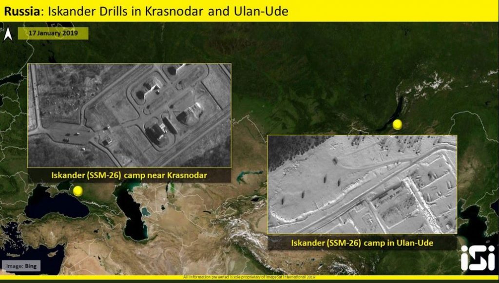 Σύμφωνα με δορυφορικές εικόνες που έγιναν διαθέσιμες από το ImageSat Intl., η Ρωσία φαίνεται να προχώρησε πρόσφατα σε ασκήσεις με το πυραυλικό σύστημα Iskander. Οι δυο ασκήσεις, έλαβαν χώρα στα κοντά στα σύνορα με Ουκρανία και σε αυτά της Κίνας και της Μογγολίας.