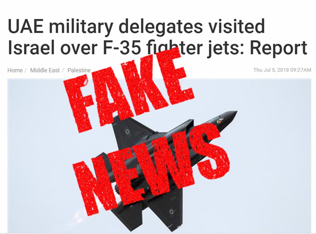 Αν και αποτέλεσε μια από τις «ειδήσεις» της προηγούμενης εβδομάδας (ΕΔΩ), η αναφορά περί επίσκεψης αντιπροσωπίας των Ηνωμένων Αραβικών Εμιράτων στο Ισραήλ για ενημέρωση περί των F-35 αποδεικνύεται Fake News.