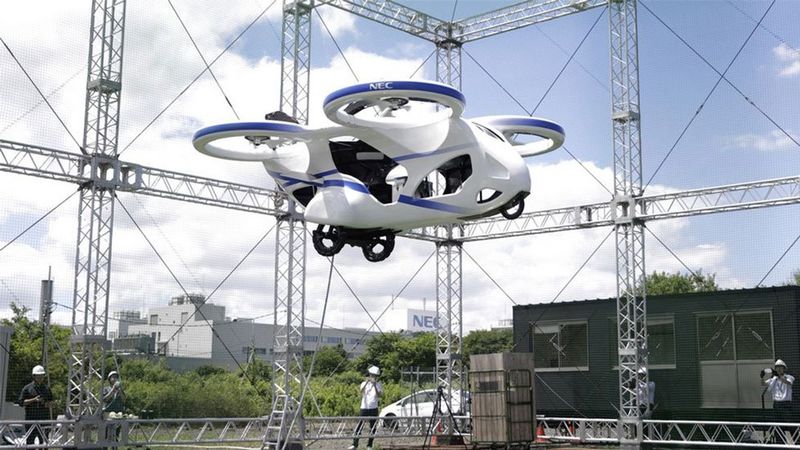 Η Ιαπωνία θέλει να ηγηθεί της βιομηχανίας των “επιβατικών” drone και η NEC Corporation είναι η πρώτη μεγάλη εταιρία της χώρας που δοκίμασε την Δευτέρα 5/8 ένα επιβατικό drone-αυτοκίνητο. Το όχημα (3.9 μέτρα Χ 1.3 μέτρα και βάρους 148 κιλών) αιωρήθηκε μόλις για ένα λεπτό (εντός ενός γιγάντιου κλωβού ασφαλείας) έφερε όμως ένα βήμα πιο κοντά στην ιδέα ενός ιπτάμενου αυτοκινήτου.
