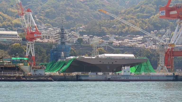 Με μια γενναία προσθήκη καταστρώματος στην πλώρη «προικίζεται» το ιαπωνικό ελικοπτεροφόρο Kaga στα ναυπηγεία Japan Marine United, κοντά στη Χιροσίμα. Η νέα επιφάνεια στην πλώρη είναι τετράγωνη, προσφέροντας μεγαλύτερο χώρο, ώστε να μπορεί το πλοίο να φιλοξενεί και να απογειώνει F-35B, από τα οποία η Ιαπωνία αναμένει να παραλάβει 42 (συν 105 F-35A).