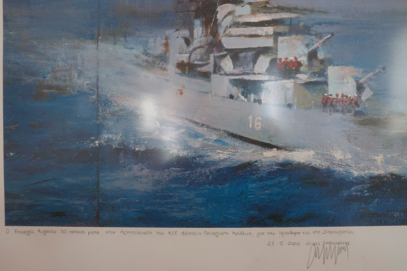 Εγώ πάντως, αφού μας ανακοίνωσε ο Παππάς την απόφασή του, πήγα στο σαλόνι των αξιωματικών όπου «αναπαυόταν» ο θυρεός της χούντας, τον ξεκρέμασα και πήγα από την δεξιά πλευρά του πλοίου. Εκείνη την ώρα ερχόταν κάποιος ο οποίος δεν ήταν «μαζί» μας και επιδεικτικά του φωνάζω: «κοίταξέ το, τόσα χρόνια το έχουμε στο καράβι δεν έμαθε να κολυμπάει» και το πετάω στο νερό όπου φυσικά βυθίστηκε αμέσως αφού ήταν μπρούτζινο!