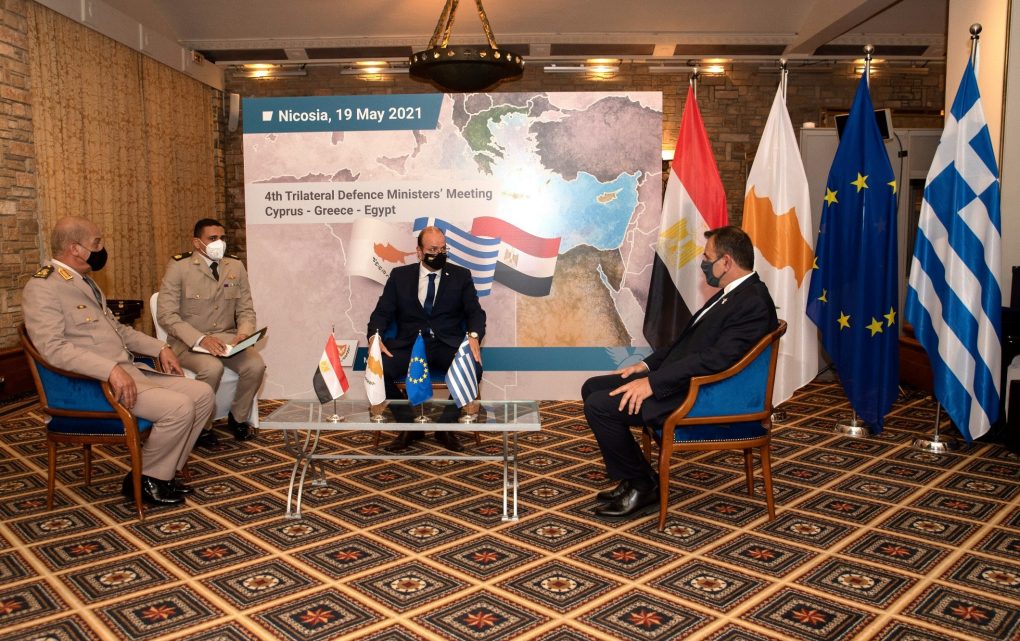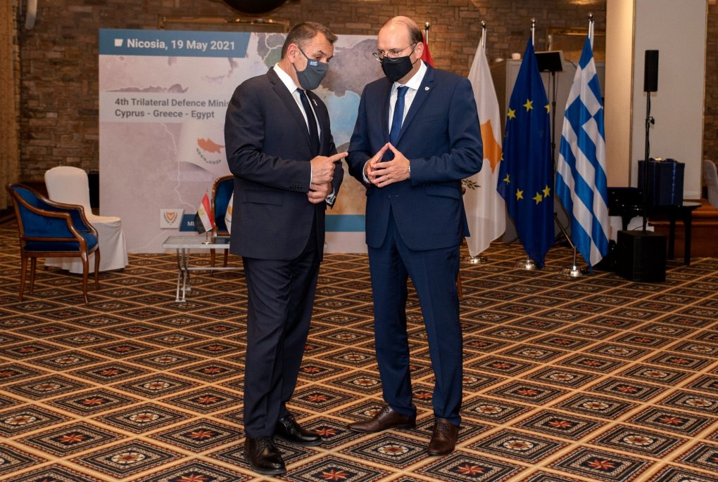 «Αποτελεί ιδιαίτερη τιμή και χαρά να ευρίσκομαι σήμερα στη Λευκωσία, μαζί με τους εκλεκτούς, φίλους και συναδέλφους μου, Υπουργούς Άμυνας της Κυπριακής Δημοκρατίας, κ. Χαράλαμπο Πετρίδη και της Αραβικής Δημοκρατίας της Αιγύπτου, Στρατηγό Μοχάμεντ Ζάκη, για την τριμερή μας συνάντηση.