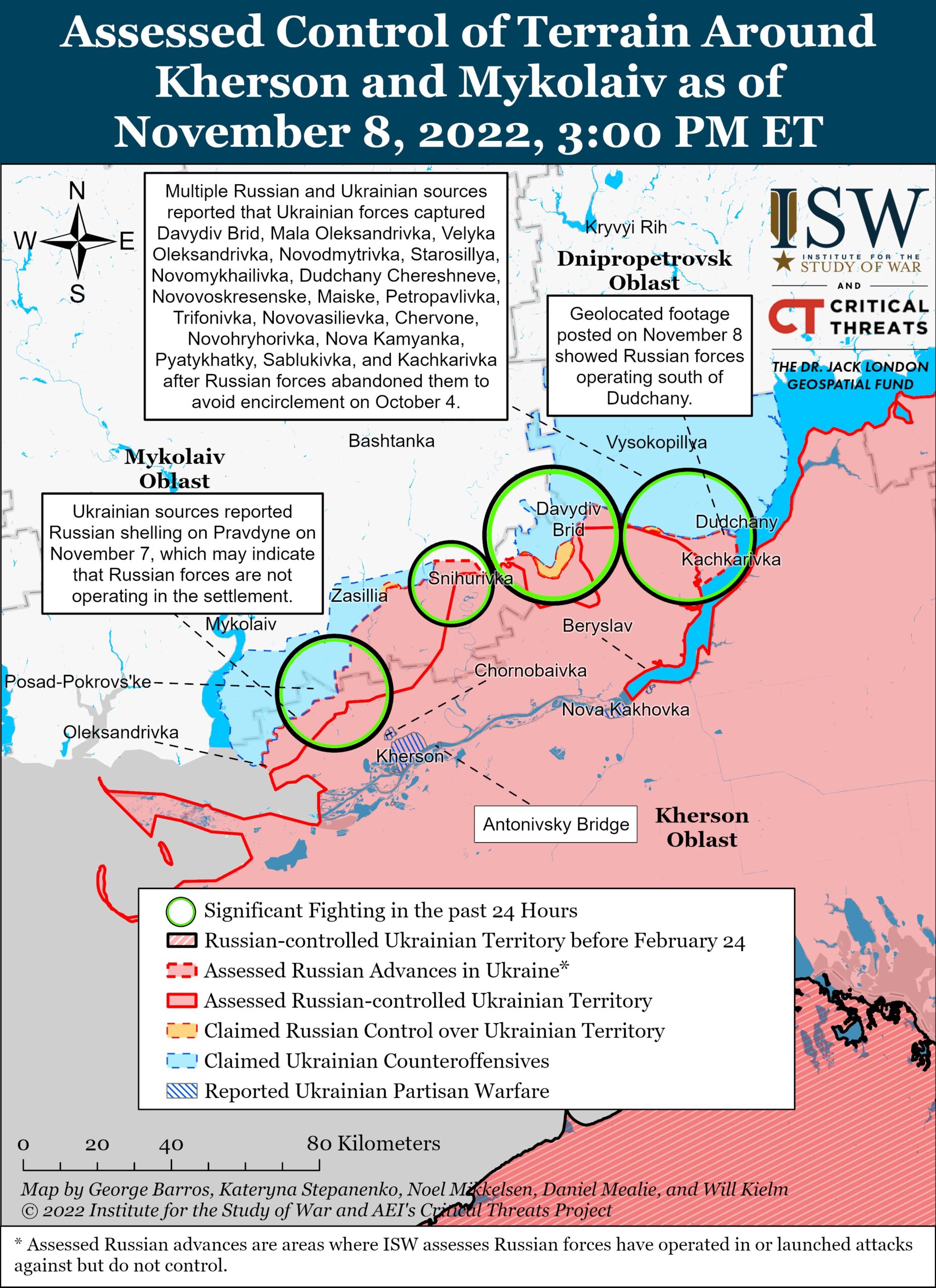 Εικόνα του μετώπου της Χερσώνας στις 8 Νοεμβρίου από το ISW. Με μπλέ χρώμα οι περιοχές που έχουν ανακαταλάβει οι Ουκρανοί. Με κύκλους τα σημεία έντονων συγκρούσεων.