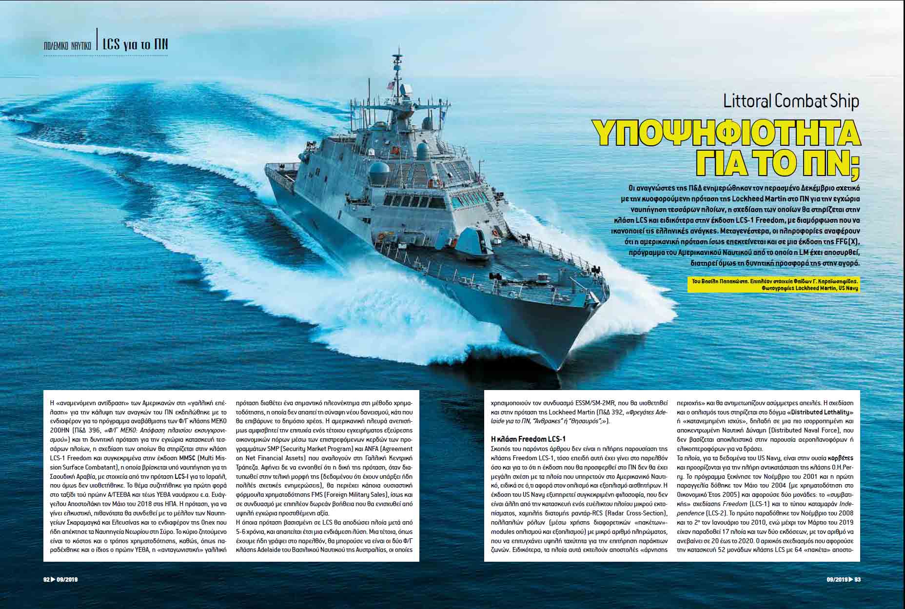 Σκοπός του παρόντος άρθρου δεν είναι η πλήρης παρουσίαση της κλάσης Freedom LCS-1, τόσο επειδή αυτή έχει γίνει στο παρελθόν όσο και για το ότι η έκδοση που θα προσφερθεί στο ΠΝ δεν θα έχει μεγάλη σχέση με τα πλοία που υπηρετούν στο Αμερικανικό Ναυτικό, ειδικά σε ό,τι αφορά στον οπλισμό και εξοπλισμό αισθητήρων. Η έκδοση του US Navy εξυπηρετεί συγκεκριμένη φιλοσοφία, που δεν είναι άλλη από την κατασκευή ενός ευέλικτου πλοίου μικρού εκτοπίσματος, χαμηλής διατομής ραντάρ-RCS (Radar Cross-Section), πολλαπλών ρόλων (μέσω χρήσης διαφορετικών «πακέτων»-modules οπλισμού και εξοπλισμού) με μικρό αριθμό πληρώματος, που να επιτυγχάνει υψηλή ταχύτητα για την επιτήρηση παράκτιων ζωνών.