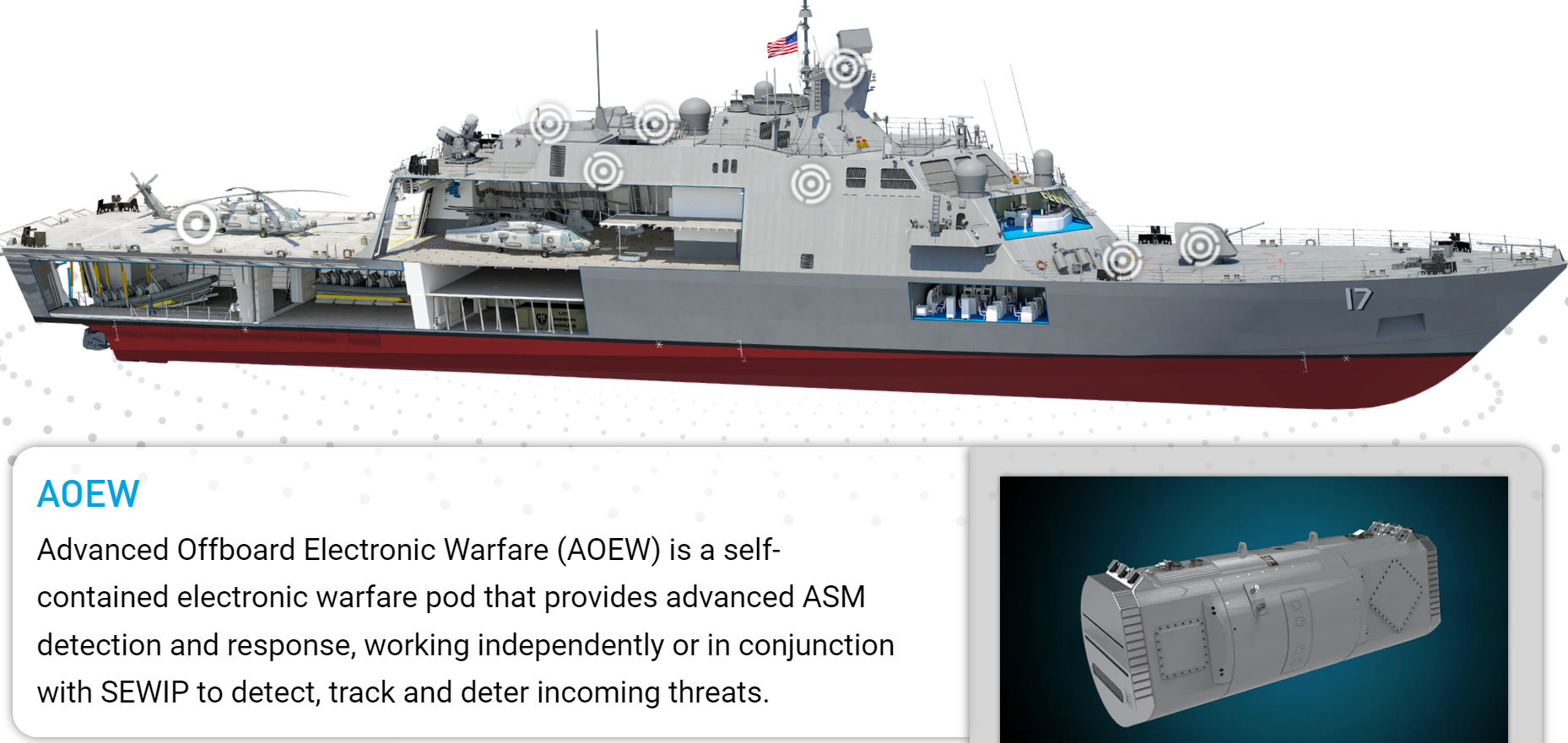 To πρόγραμμα Advanced Off-Board Electronic Warfare (AOEW) είναι μια ακόμη λύση που δοκιμάζει το αμερικανικό Ναυτικό για την αντιμετώπιση επιθέσεων κορεσμού από αντιπλοϊκούς. Η Lockheed Martin’s στα πλαίσια του AOEW, έχει αναπτύξει το σύστημα Active Mission Payload (AMP) AN/ALQ-248, που είναι ένα μεγάλων διαστάσεων ατρακτίδιο ηλεκτρονικού πολέμου, που μεταφέρεται από ένα από τα οργανικά ελικόπτερα MH-60R ή MH-60S Seahawk του πλοίου.