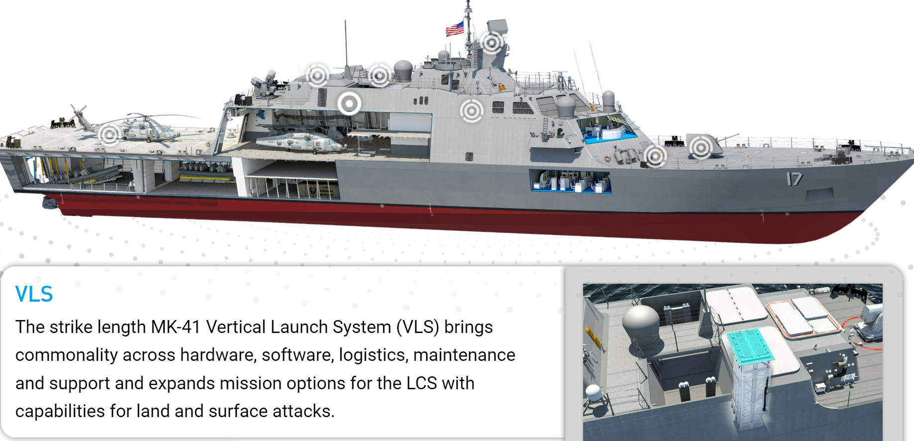 Το παραπάνω είναι το πιο “εξωτικό” σύστημα, που θα μπορούσε να μπει στο σκάφος, σε μια μελλοντική του εξέλιξη. Το αναφέρουμε όμως μιας και οι LCS ως σχεδιασμός έχουν συμπεριλάβει την πρόβλεψη για τοποθέτηση τέτοιων όπλων κατευθυνόμενης ενέργειας (laser). Συγκεκριμένα στο τρίτο σημείο τοποθέτησης οπλισμού στο μεσόστεγο, εκεί που σήμερα μπαίνει εκτοξευτής πυραύλων Hellfire κατά σκαφών επιφανείας, ενώ και το σύστημα μάχης έχει σχετικές ρουτίνες.