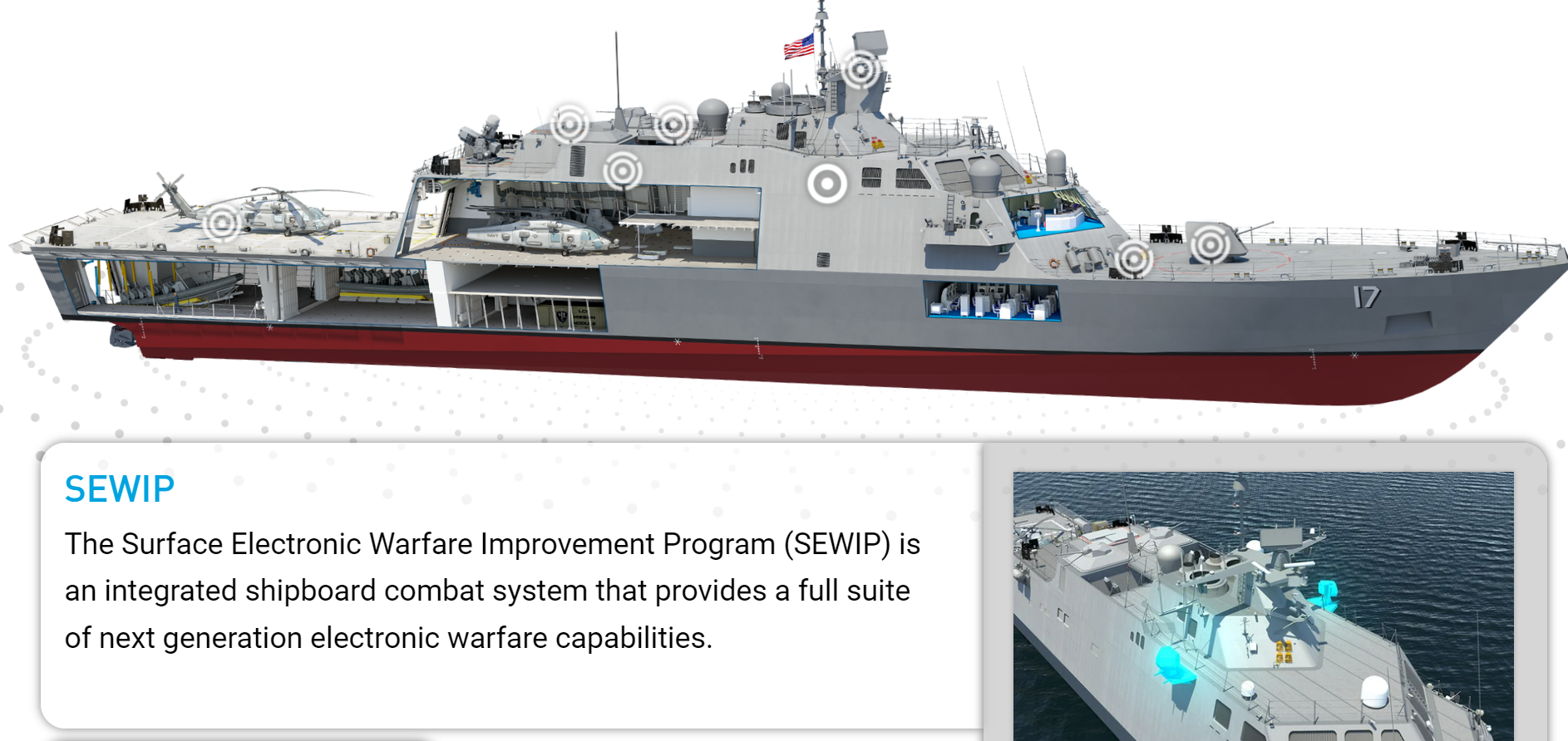 Το ναυπηγείο έχει μελετήσει την τοποθέτηση στα LCS Freedom της 2ης έκδοσης του αμερικανικού συστήματος ηλεκτρονικού πολέμου SEWIP, σε έκδοση Lite. Εδώ θα πρέπει να πούμε όμως, πως το ΠΝ, στην περίοδο που έλεγχε τις προτάσεις των υποψηφίων φρεγατών, το είχε χαρακτηρίσει ως μη ικανοποιητικό. Έτσι, οι Αμερικανοί αναγκάστηκαν να καταφύγουν στο Ισραήλ, προκειμένου να εξασφαλίσουν το σύστημα Scorpius-N της ΙΑΙ για την πρότασή τους.