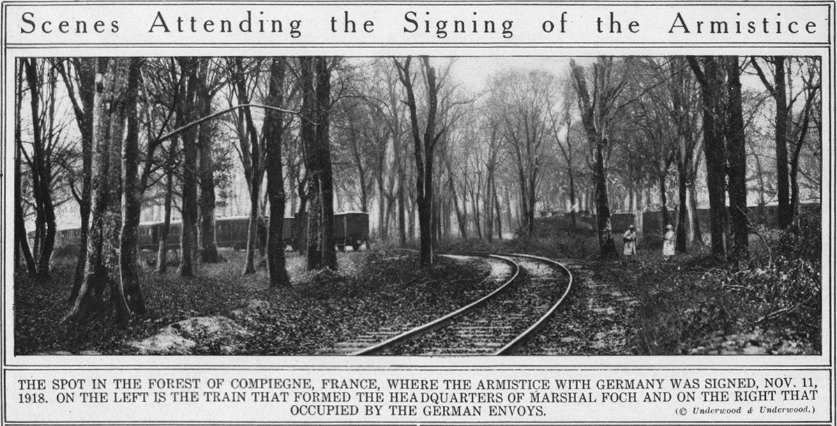 Στις 8 Νοεμβρίου 1918 δύο τραίνα σταμάτησαν στις παρακαμπτήριες γραμμές της Ρετόντ, στο δάσος της Κομπιέν, 64 χλμ βόρεια του Παρισιού. Το ένα τραίνο, ο πρώην αυτοκρατορικός συρμός του Ναπολέοντα του Γ΄, μετέφερε Γερμανούς πολιτικούς και υψηλόβαθμους αξιωματικούς, κατάκοπους από το ολονύκτιο και υπό άκρα μυστικότητα ταξίδι τους μέσα από τις γραμμές του μετώπου. Το άλλο τραίνο στην Rethondes ήταν του Στρατάρχη Φος και των αντιπροσώπων των Συμμάχων.