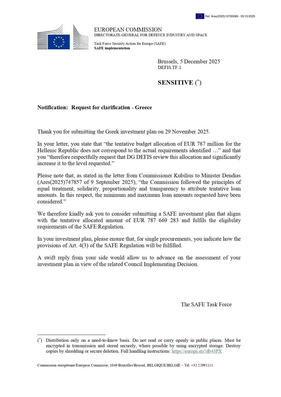 Ακόμη, μας επισημάναν πως πρέπει στις προτεινόμενες προμήθειες μας, να εξηγήσουμε πως θα τηρηθούν οι διαδικασίες που προβλέπονται στο άρθρο 4, παράγραφος 3, του κανονισμού SAFE. Τι λέει αυτό; Μιας και ο κανονισμός αφορά χρηματοδότηση από κοινού προμηθειών, των χωρών που συμμετέχουν, αν μια χώρα υποβάλλει μια πρόταση μόνη της, χωρίς να έχει εξασφαλίσει συνεργασία, τότε πρέπει να λάβει όλα τα απαραίτητα μέτρα ώστε να είναι διαθέσιμη (ως πλαίσιο) και σε τουλάχιστον ακόμη ένα κράτος. Πάλι με απλά λόγια: η Ελλάδα, στον κατάλογο που είχε υποβάλλει, είχε εντάξει πολλές επιλογές εξοπλισμών που αφορούν μόνο την ίδια. Χωρίς δηλαδή να έχει βρει συνεργαζόμενη χώρα εντός SAFE. Έτσι η Κομισιόν μας θυμίζει πως αν κάνουμε κάτι τέτοιο, πρέπει να είμαστε έτοιμοι να βρούμε κάποιον συνεργάτη, ή έστω ενδιαφερόμενο. Μια επισήμανση που δείχνει και την ελληνική βιασύνη -έως και προχειρότητα- στην όλη διαδικασία.