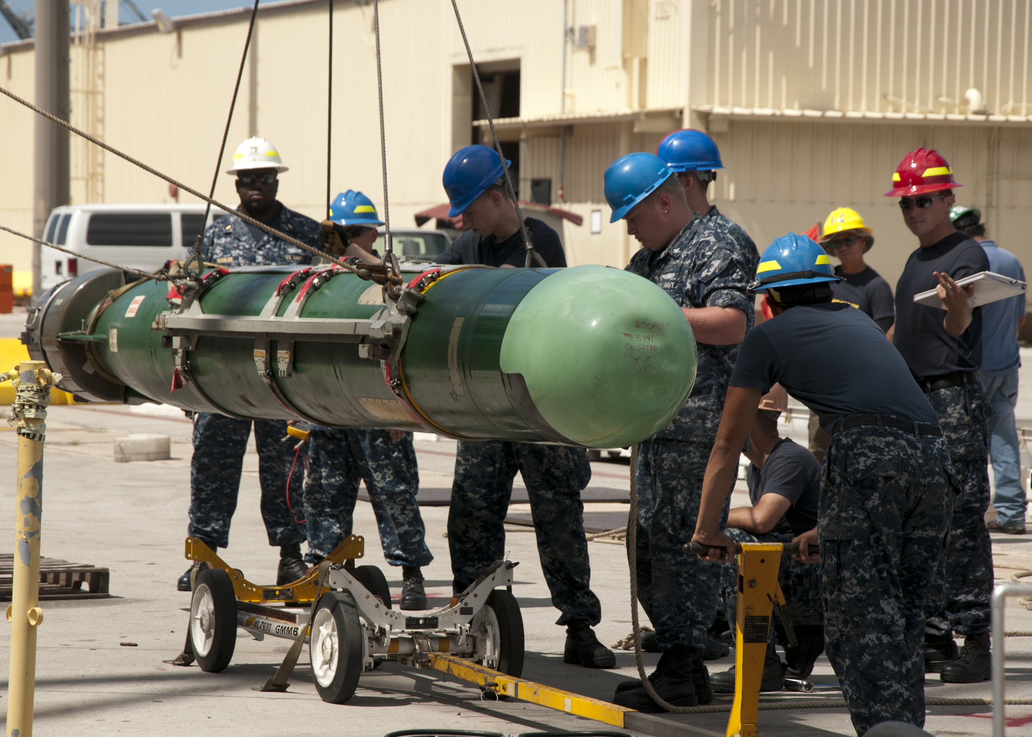 Ναύτες του USS Frank Cable (AS 40) καθοδηγούν μια τορπίλη Mark 48 ADCAP (Advanced Capability) που αφαίρεσαν από το Los Angeles-class USS Oklahoma City (SSN 723). (U.S. Navy photo by Mass Communication Specialist 1st Class Ricardo Danan/Released)