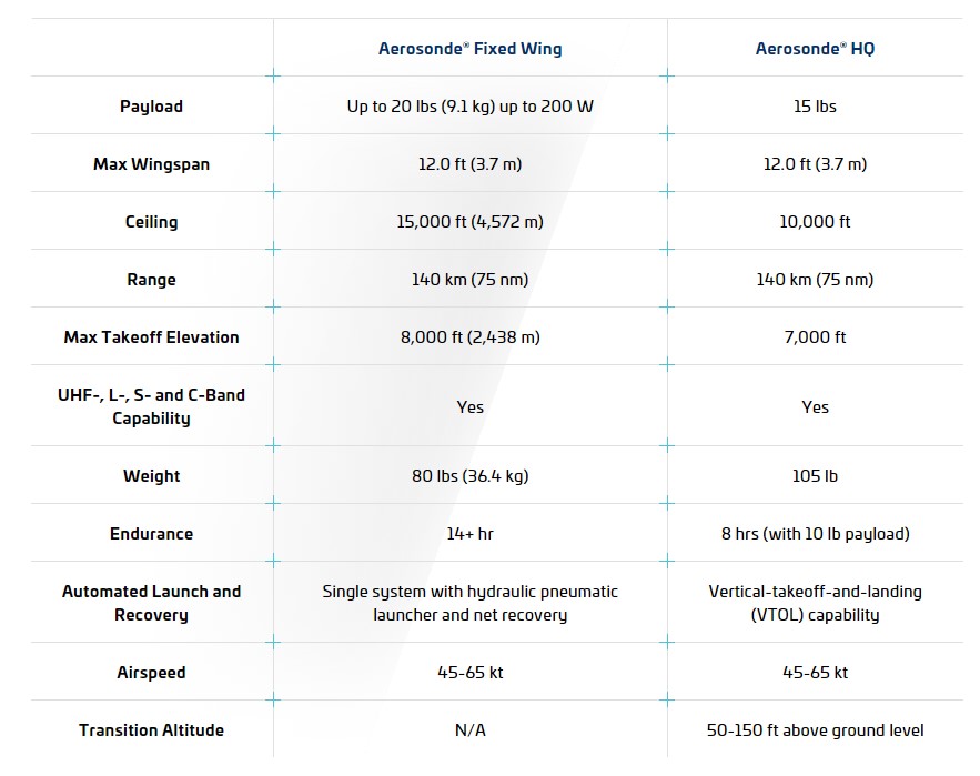 Το σύστημα παράγεται σε δύο εκδόσεις επιτήρησης/στοχοποίησης με εμβέλεια έως 140 χιλιόμετρα: την εκτοξευόμενη από καταπέλτη Aerosonde fixed wing και την κάθετης απογείωσης Aerosonde HQ, προσφέροντας ευελιξία ανάλογα με την αποστολή.