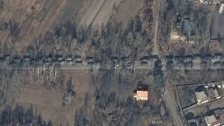 Δορυφορικές φωτογραφίες που τραβήχτηκαν χθες Κυριακή εικονίζουν μεγάλη οχηματοπομπή του ρωσικού στρατού, συμπεριλαμβανομένων αρμάτων μάχης, κινούμενη προς την κατεύθυνση του Κιέβου, περίπου 64 χιλιόμετρα μακριά, ανέφερε η αμερικανική ιδιωτική εταιρεία Maxar Technologies. Η οχηματοπομπή είχε μήκος περίπου 5 χιλιόμετρα, τόνισε η Maxar.