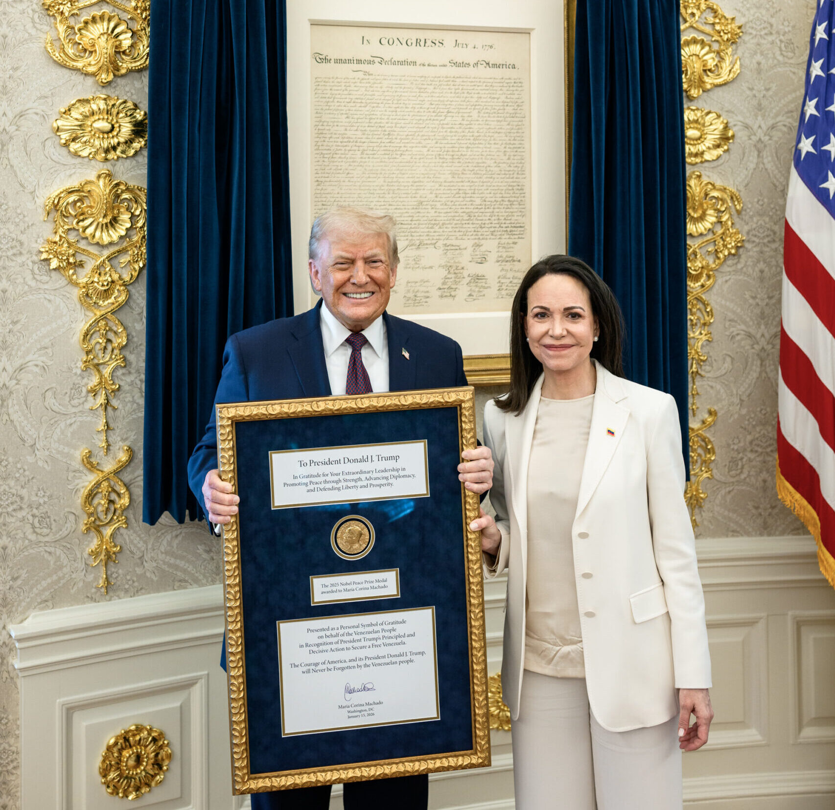 Το Νόμπελ Ειρήνης αποτελούσε διακαή πόθο του Ντόναλντ Τραμπ και η Ματσάδο του το αφιέρωσε όταν της απονεμήθηκε πέρυσι. Ωστόσο η νορβηγική επιτροπή των Νόμπελ κατέστησε σαφές μέσω ανακοίνωσης πως το βραβείο «δεν μπορεί να ανακληθεί, να μοιραστεί ή να μεταβιβαστεί σε άλλους».
