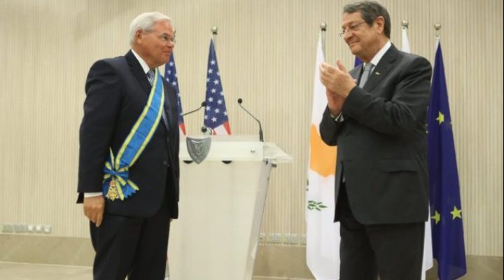 Με το παράσημο του Μεγαλόσταυρου του Τάγματος του Μακαρίου Γ΄ τίμησε τη Δευτέρα το βράδυ ο Πρόεδρος της Κυπριακής Δημοκρατίας, Νίκος Αναστασιάδης, τον Αμερικανό γερουσιαστή και πρόεδρο της Επιτροπής Εξωτερικών Σχέσεων της Γερουσίας των ΗΠΑ, Ρόμπερτ Μενέντεζ, ο οποίος τόνισε πως στόχος του είναι να δει και τον τελευταίο Τούρκο στρατιώτη να φεύγει από την Κύπρο.