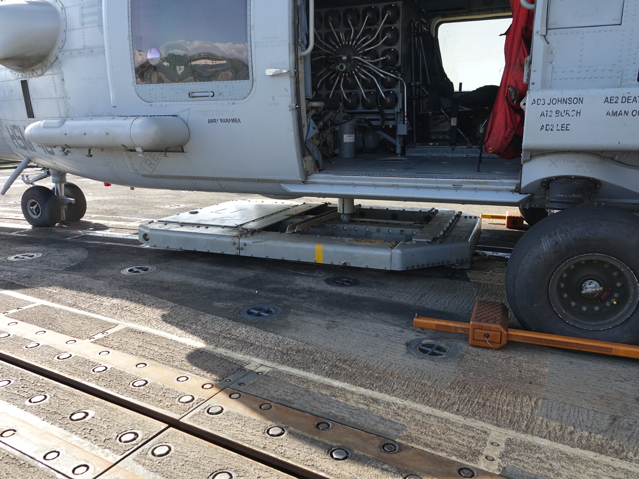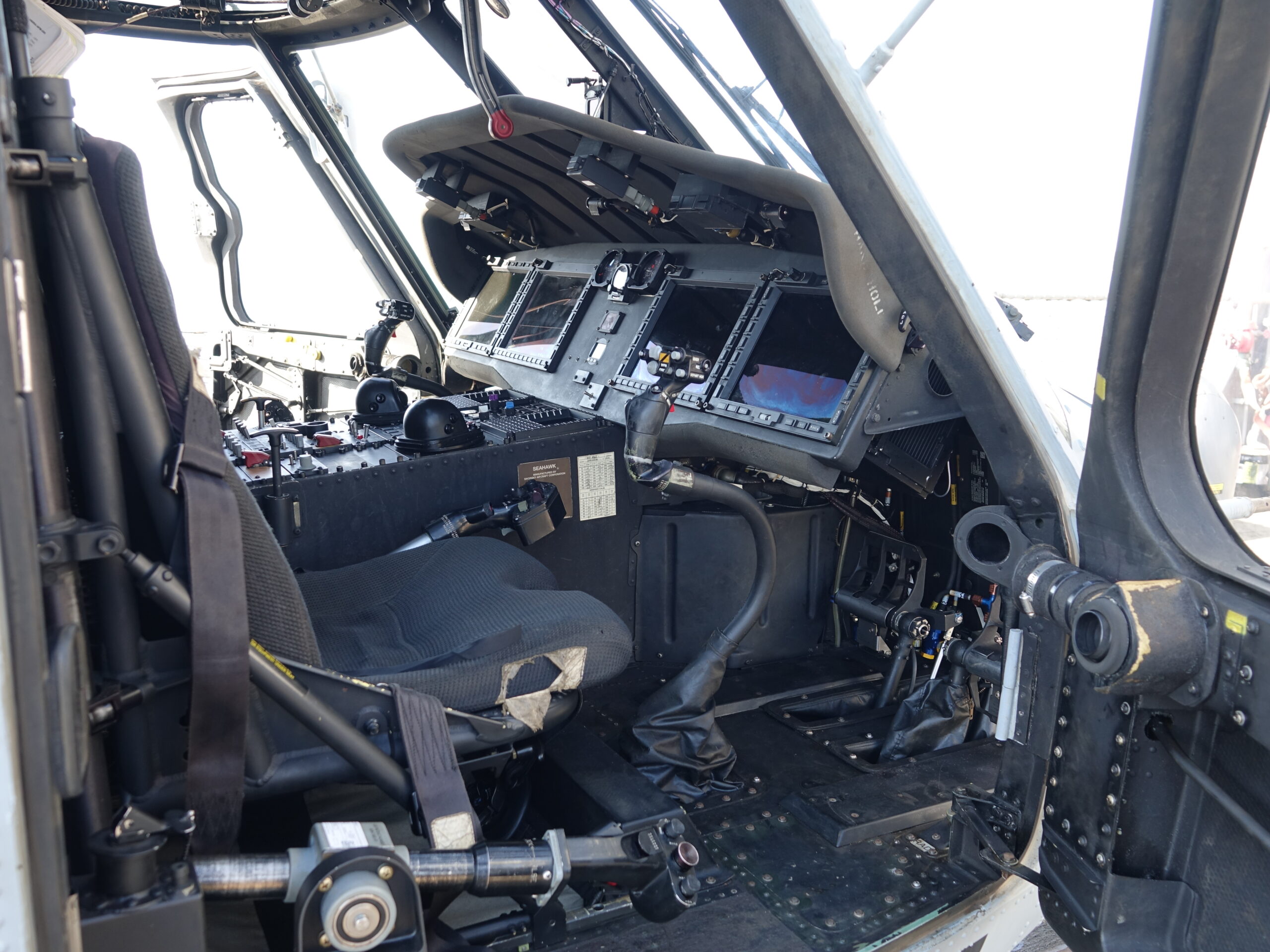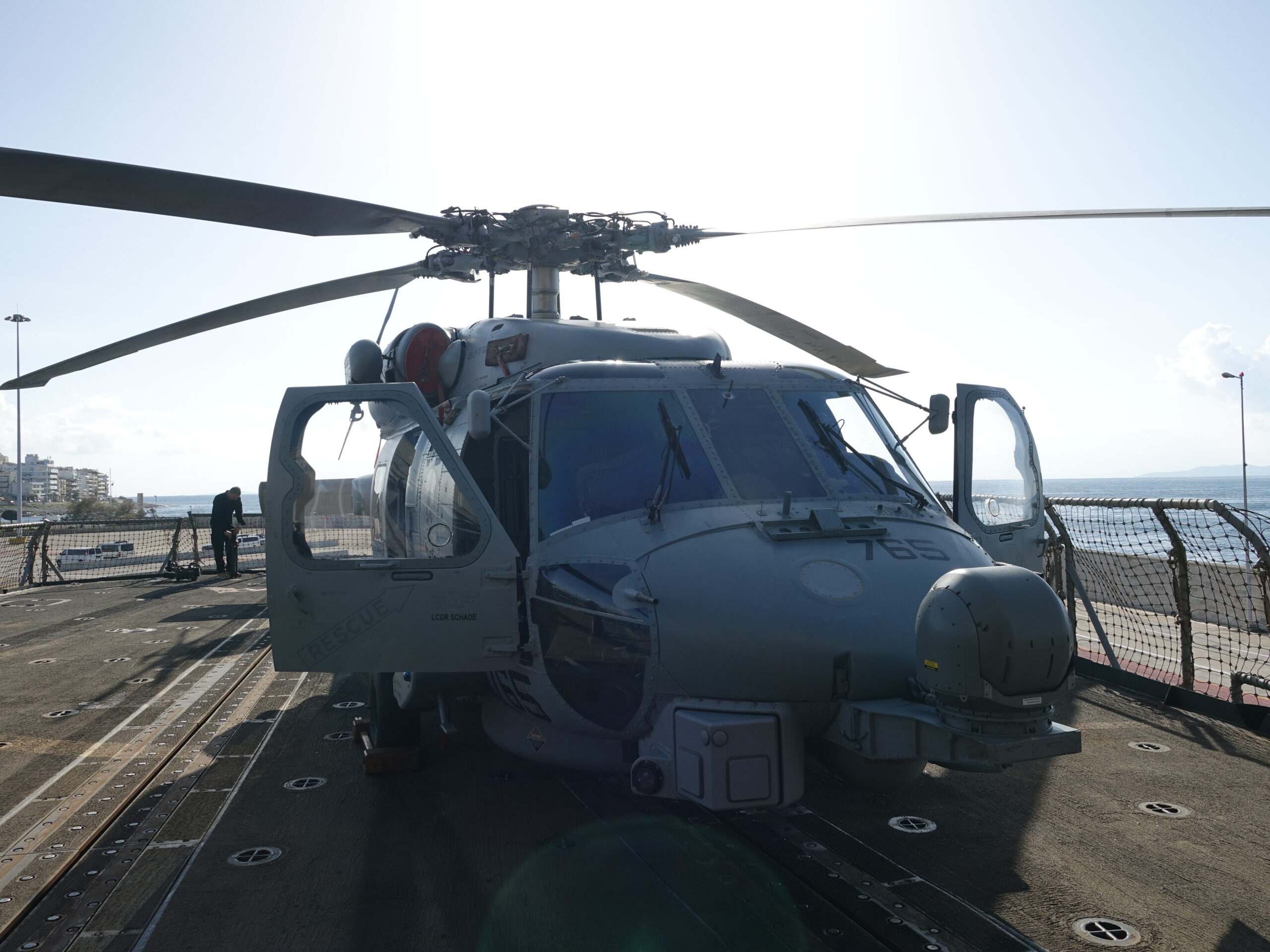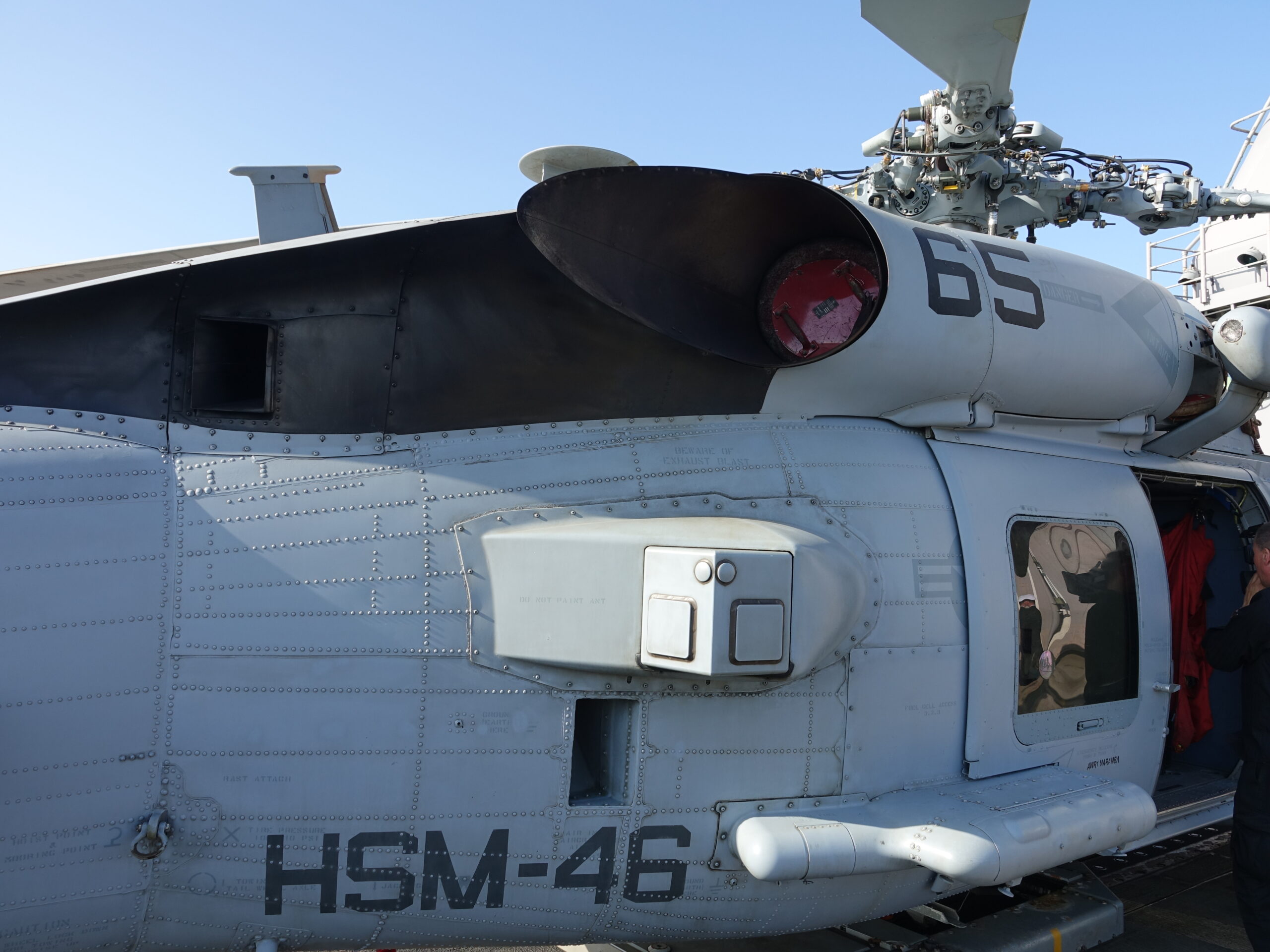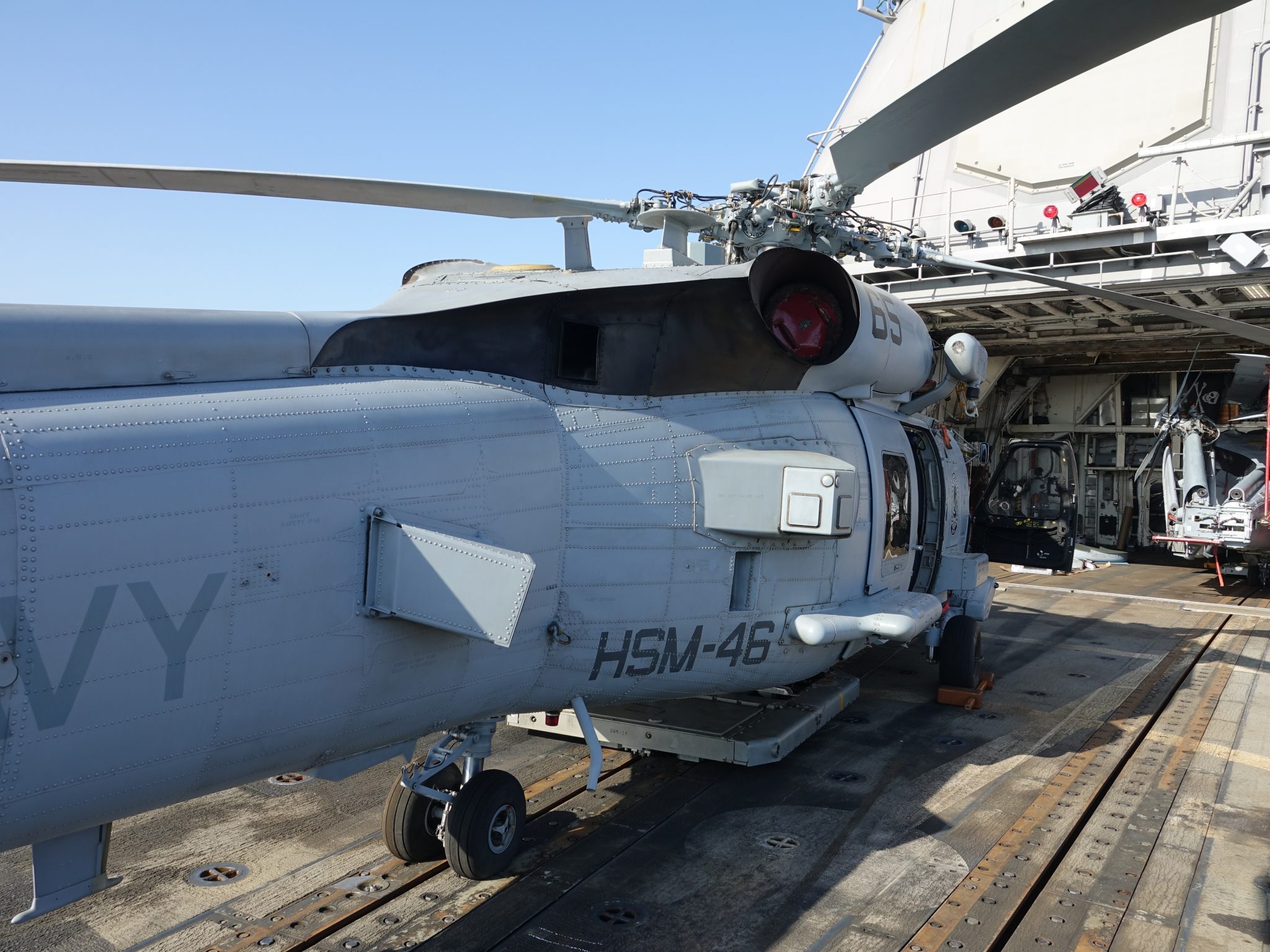 Στο παραπάνω όμως αφιέρωμα, είχαμε αποφύγει να μοιραστούμε μαζί σας ένα μικρό δεύτερο πακέτο φωτογραφιών, που αφορούσε τα ελικόπτερα ΜΗ-60R που φιλοξενούσε το πλοίο. Τα καταδρομικά κλάσης Ticonderoga μπορούν να φιλοξενήσουν δυο ελικόπτερα MH-60R, στριμωχτά μεν, αλλά μπορούν. Το Leyte Gulf όταν το επισκεφτήκαμε είχε πάνω του δυο ελικόπτερα, ένα εντός του υποστέγου, κι άλλο ένα εκτός, στο ελικοδρόμιο. Το φιλόξενο πλήρωμα του ελικοπτέρου μας επέτρεψε να φωτογραφίσουμε ότι θέλαμε (από το ελικόπτερο), κάτι το οποίο δεν έγινε για παράδειγμα στους χώρους του καταδρομικού.