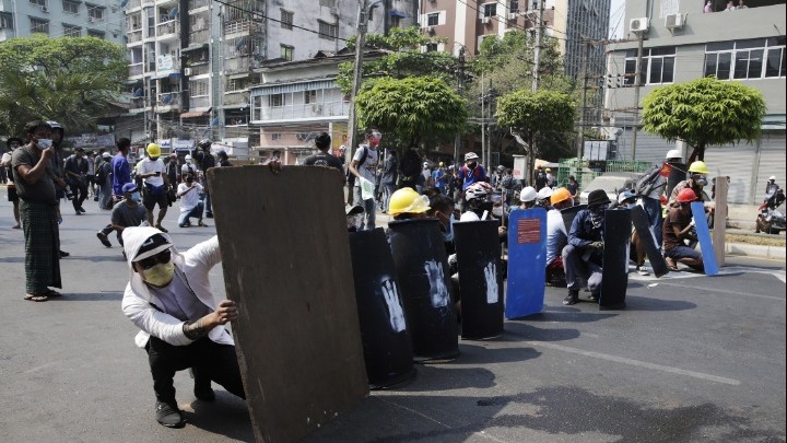 Στη συνοικία Σαν Τσαούνγκ της οικονομικής πρωτεύουσας Ρανγκούν, η αστυνομία κατέστρεψε αυτοσχέδια οδοφράγματα που έστησαν οι διαδηλωτές και έκανε χρήση δακρυγόνων και χειροβομβίδων κρότου λάμψης για να διαλύσει μικρές συγκεντρώσεις.