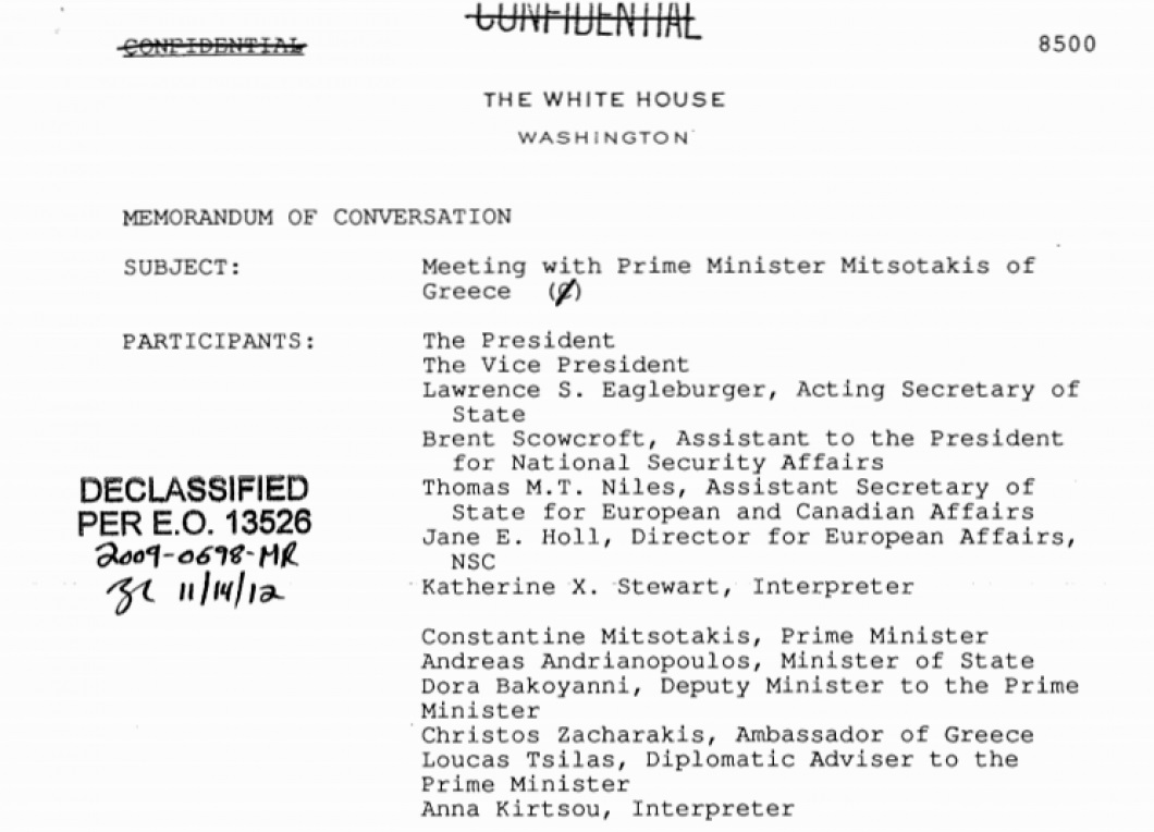 Το έγγραφο αυτό, είναι απόσπασμα των πρακτικών της συζήτησης του τότε Έλληνα Πρωθυπουργού με τον Αμερικανό Πρόεδρο στον Λευκό Οίκο το Νοέμβριο του 1992 και περιγράφει τον τρόπο που ο Κωνσταντίνος Μητσοτάκης έπεισε τον αείμνηστο Πρόεδρο των ΗΠΑ Τζ. Μπους προκειμένου να καθυστερήσει η ένταξη των Σκοπίων στον ΟΗΕ, εφόσον δεν υποχωρούσαν στη χρήση του ονόματος “Μακεδονία”.