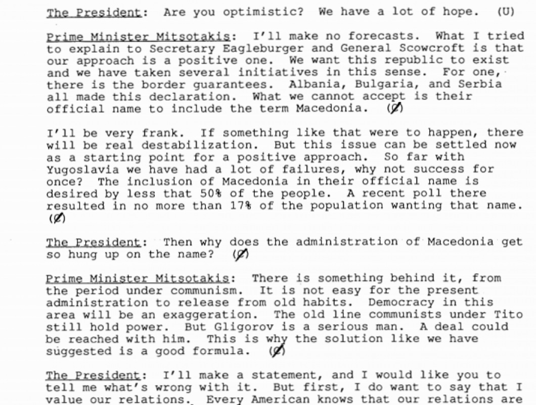 Σύμφωνα με τα πρακτικά της συνάντησης του Τζ. Μπους με τον Κωνσταντίνο Μητσοτάκη, «Ο Έλληνας Πρωθυπουργός προειδοποίησε τον Αμερικανό Πρόεδρο πως εάν η λέξη ‘Μακεδονία’ συμπεριληφθεί στο όνομα της νέας δημοκρατίας, θα υπάρξει πραγματική αποσταθεροποίηση στην περιοχή.