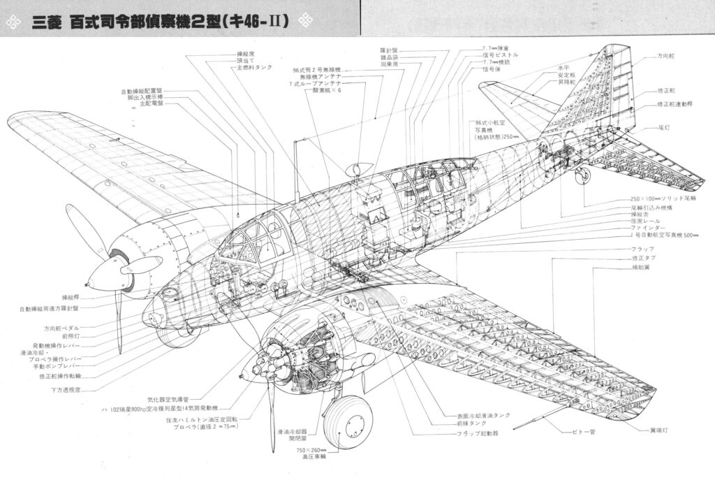 Η άτρακτος ήταν στρογυλεμένη και κατέληγε σε κλασικό μονό κάθετο ουραίο. Η καμπίνα διακυβέρνησης ήταν χωρισμένη στα δύο, η πρώτη για τον πιλότο και μια δεύτερη πιο πίσω για τον χειριστή ασυρμάτου – και οπίσθιο πυροβολητή συγχρόνως. Μεταξύ των δύο τμημάτων της υπήρχε ο χώρος των καμερών και μιας μεγάλης δεξαμενής καυσίμου, χωρητικότητας 1.660 λίτρων, ώστε να παραμένει το κέντρο βάρους κατά το σχέδιο των μηχανικών. Το Ki-46 διέθετε επίσης συμβατικό σύστημα προσγείωσης με ανασυρόμενο ουραίο τροχό. Αντί για τους ελαφρύτερους Nakajima Ha-25, η εταιρεία προτίμησε τους δικούς της αερόψυκτους αστεροειδείς διπλής σειράς, τους Mitsubishi Ha-26 των δεκατεσσάρων κυλίνδρων με ισχύ 900 ίππων, και υπερσυμπιεστές μονής ταχύτητας που περιέστρεφαν τρίφυλλες έλικες μεταβλητού βήματος. Τα στενά καλύμματα των κινητήρων προσέθεταν σημαντικά στην όλη αεροδυναμική του αεροσκάφους.