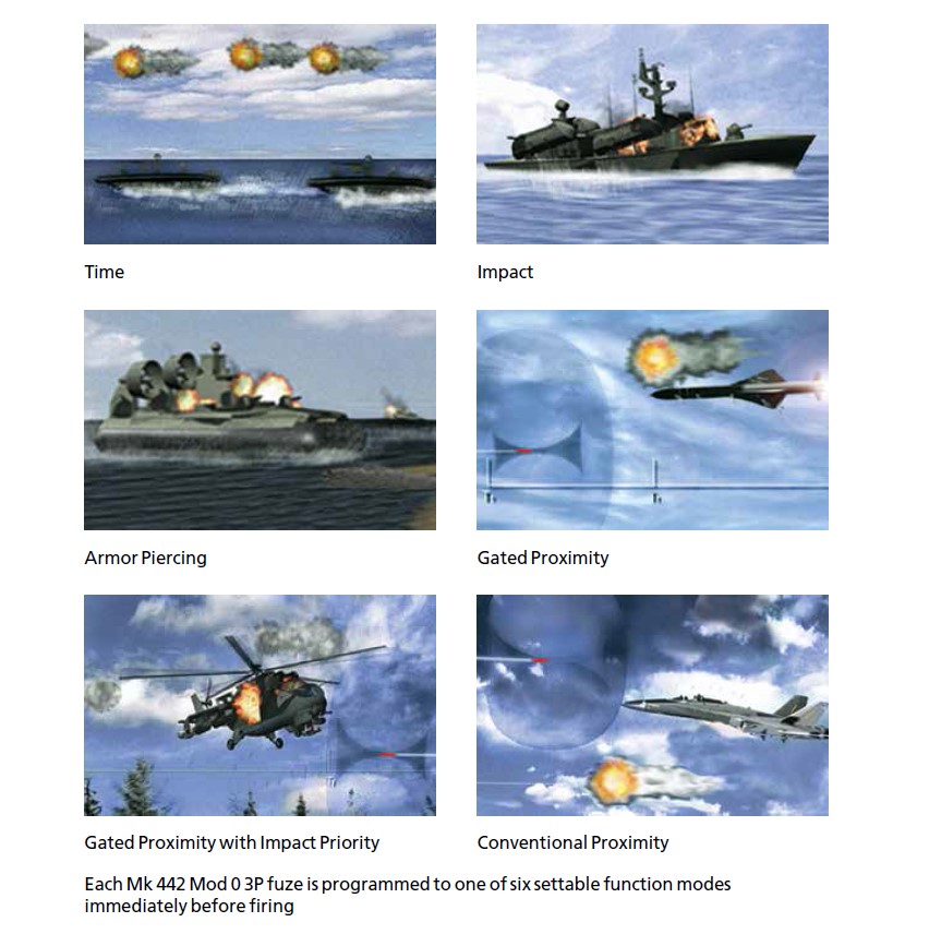 Ήδη από το 2006, τη στάνταρ επιλογή των χρηστών, αποτελούν τα πυρομαχικά Mk295 Mod0 3P-HE, πιο απλά 3P, της BAE Systems, με εμβέλεια 17 χιλιόμετρα. Ο πυροσωλήνας του βλήματος έχει έξι επιλογές προγραμματισμού, που επιλέγονται χιλιοστά του δευτερολέπτου πριν πυροδοτηθει το βλήμα, καθώς δέχεται διαρκώς δεδομένα από το σύστημα ελέγχου πυρός του πλοίου, ανάλογα την απειλή. Το 3P έχει λειτουργία AirBurst, κατά την οποία απελευθερώνει πάνω από 8.000 θραύσματα Βολφραμίου, καλύπτοντας επιφάνεια τετρακοσίων τετραγωνικών μέτρων.