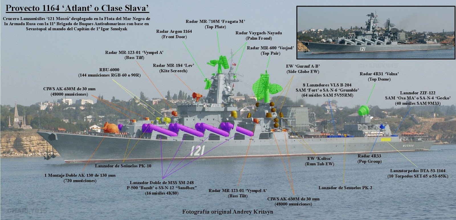 - Η συστοιχία αντιπλοϊκών πυραύλων (8 από κάθε πλευρά) δεν φαίνεται να έχει θιγεί. Επίσης η περιοχή πίσω από το μεσόστεγο, εκεί που βρίσκονται οι 8 εκτοξευτές των πυραύλων S-300 είναι άθικτη. Άρα τα κύρια όπλα του πλοίου δεν έχουν εκραγεί ή πληγεί.